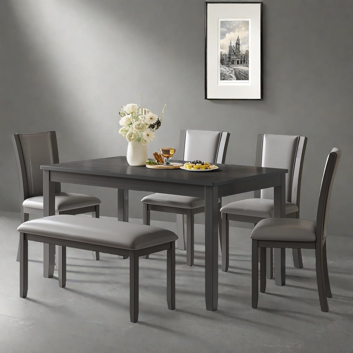 This product includes all necessary components for a full six-person dining setup: one rectangular table, four upholstered chairs, and one matching bench. Assembly is required, and users should follow the provided instructions carefully to ensure stability and safety. To maintain the woodgrain finish, avoid prolonged exposure to direct sunlight or moisture, which may cause fading or warping. Clean the table surface with a slightly damp cloth and mild cleaner; avoid abrasive cleaners that could damage the veneer. For the upholstered seats, spot-clean fabric stains gently with a fabric-safe cleaner and allow to air dry completely. Keep the furniture in a dry environment and avoid placing heavy objects directly on the tabletop to preserve its appearance over time.