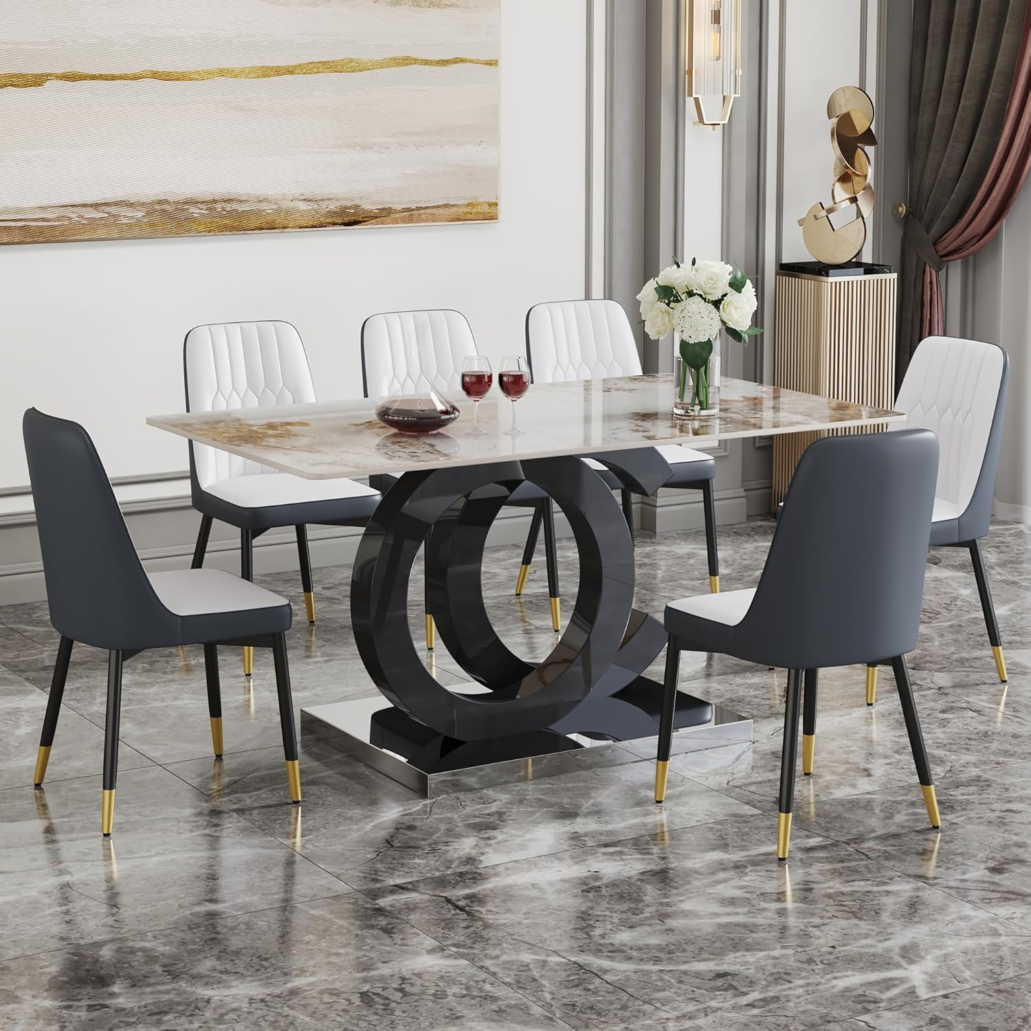 This Luxrious dining table set for 6 combines innovative design with practical functionality, making it an ideal centerpiece for kitchens, dining rooms, or living areas. Crafted with attention to both form and function, the set features a sintered stone tabletop paired with six modern dining chairs that deliver lasting style and comfort. The sintered stone surface provides a sleek, contemporary look while offering exceptional resistance to stains, heat, and scratches—perfect for everyday meals and entertaining guests. With its rounded tempered glass corners, the table adds a refined touch while enhancing safety, especially in homes with children or pets. Whether you’re enjoying a quiet family dinner or hosting a festive gathering, this dining set blends elegance and durability to elevate your space.