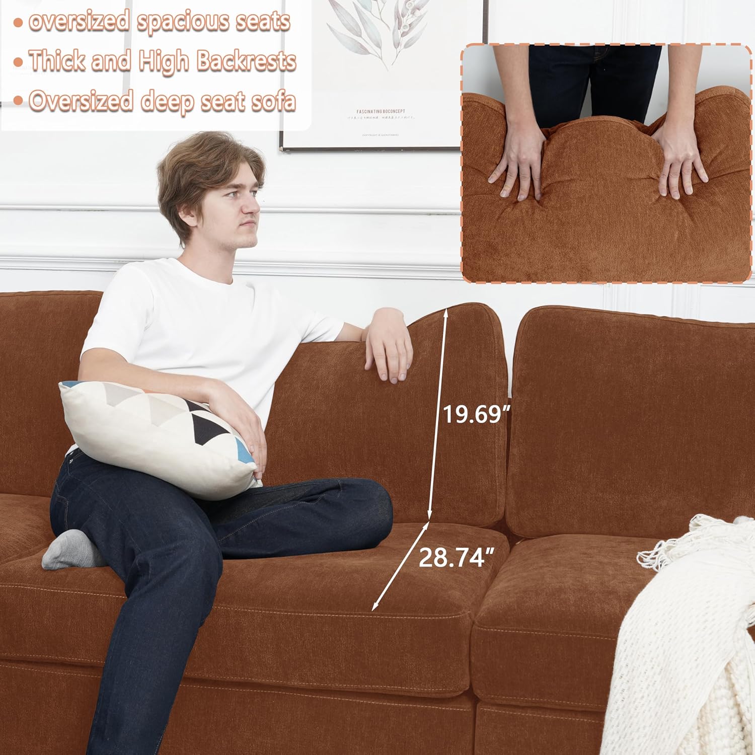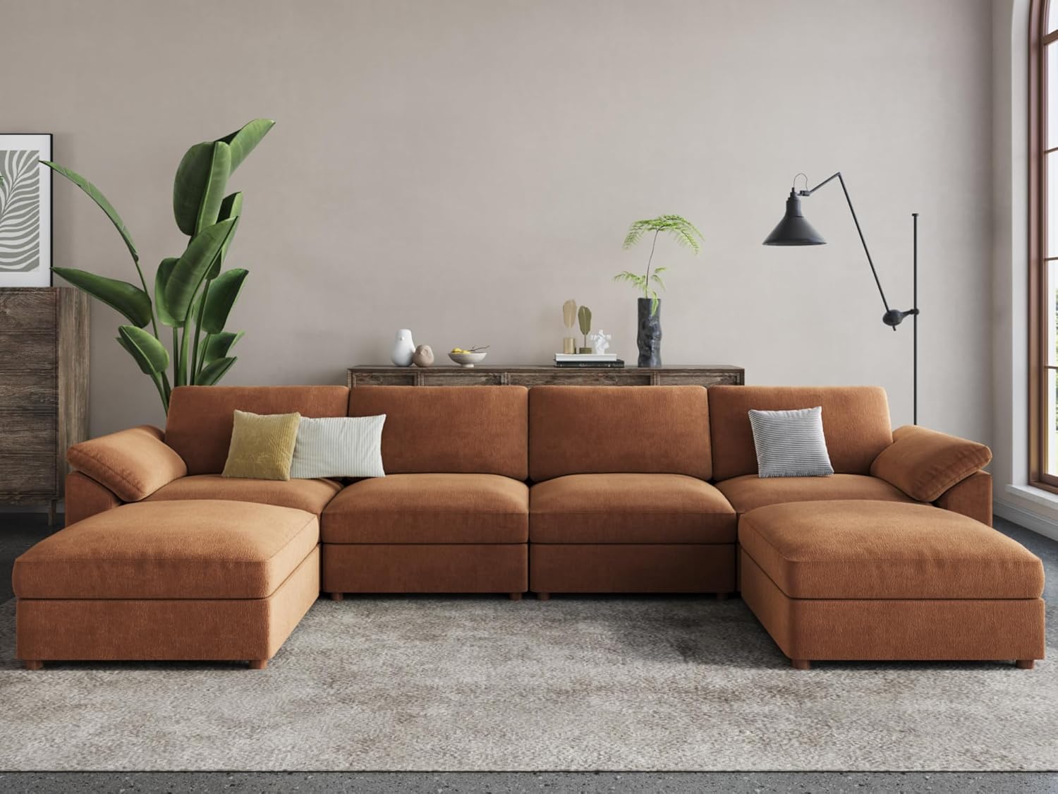 Beautiful & Worth Every PennyBrown Camel Orange Two Ottomon two Chaise style in Chenille fabricDon’t listen to bad reviews about back cushions I think they fixed it. These cushions are so full and fluffy after following review instructions I removed them from covers fluffed and left 24 hours and could hardly fit them back in they were so big. Absolutely perfect thickness honestly.I’ll start with the good and end with the minor issue that was fixed. I got rid of a hard coil+foam seated sectional looking for something sturdy wood base, but softer seating but not cloud like soft or slouchy cushions that don’t bounce back. I chose this sectional brown (it’s really camel color like burnt orange) stunning sofa very modern color. I didn’t want a boneless sloppy looking couch I wanted comfort that’s firm but easy on the joints and deep seat large expensive couch look. I GOT EXACTLY THAT PURE ELEGANCE. It’s as big as you want it cause it’s modular. I ordered two middle seats a right and left corners and two ottomans like the two chaise style 147 long I think. It has really deep seats. Its legs are solid wood super nice. It doesn’t sit too low to the ground it’s very normal sofa height. My only complaint is I wish it was a tad bit softer as I consider it medium firm. But it’s okay I wanted uniform structure. The fabric is fantastic it’s soft Chenille very comfortable to the touch.It was all delivered together in 7 boxes was super easy to put together. The connector piece that connects does need to be put on upside down and then flip it over carefully. It doesn’t come with instructions but you just screw feet on easy, and screw each pc to eachother with the black connector and the backs and arms slide into brackets easy. II did Fluff the back cushion for 24 hours letting them sit out although I found taking them out for a few hours they were the same the next day thick and comfortable.Before I start the bad: note customer service by email was absolutely amazing 5 stars….I had one corner piece that had some stripped anchors inside the seat connector brackets that connects the base to the arm. I tried fixing but once I realized the wood was stripped inside the sofa and it wouldn’t hold the anchor for the screw to stay tight so the arm rest was loose. I sent video pictures and descriptions and they immediately replied and replaced that one seat and shipped it so fast. So although I had this problem it was fixed and is super sturdy now.Some review said the ottoman cushions are different than sofa not true they are exactly the same.Shipping A+Install Easy A+Comfort B+Size A+Material A+Look A+Seat Depth A+Sturdiness A- (only because I required a replacement piece) otherwise it would have been A+The connectors to connect modular PCs work great nothing is moving around but I even have it on a rug. The feet have rubber bottoms so even without the rug it didn’t move.I searched and searched for a reasonable price luxury sofa under 1K with great durable fabric deep seats and large and this is a 3K-5K sofa like Joy bird and others but without the high cost. Absolutely worth every penny. I highly recommend.