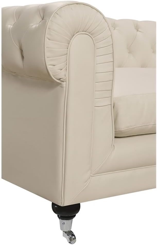 Crafted with attention to detail, this sofa features deep button tufting that not only enhances its visual appeal but also contributes to lasting comfort. The use of bonded leather in a soft French Ivory tone gives the piece a rich, creamy appearance that brightens interiors while remaining versatile enough to complement a wide range of color schemes and decor styles. It’s more than just furniture—it’s a statement of taste and lifestyle, inviting guests to linger and relax.