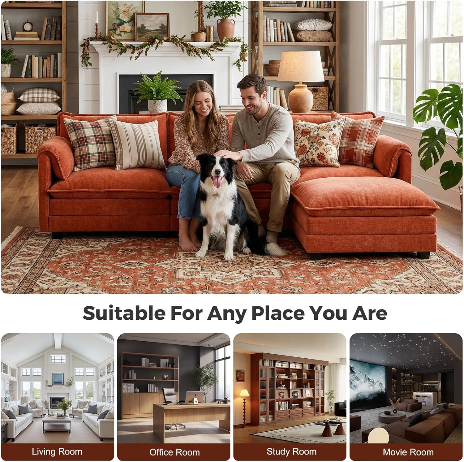 The ELUCHANG Oversized 113″ Modular Sectional Sofa redefines comfort and adaptability in modern living spaces. This L-shaped cloud couch combines generous proportions with thoughtful design to create a centerpiece that supports both relaxation and social interaction. Engineered with a solid wood frame rated for 350 lbs per seat, it offers unmatched stability without compromising on plushness. The terracotta chenille fabric exterior maintains its rich hue and soft texture year after year, resisting wear while enhancing any room’s aesthetic.