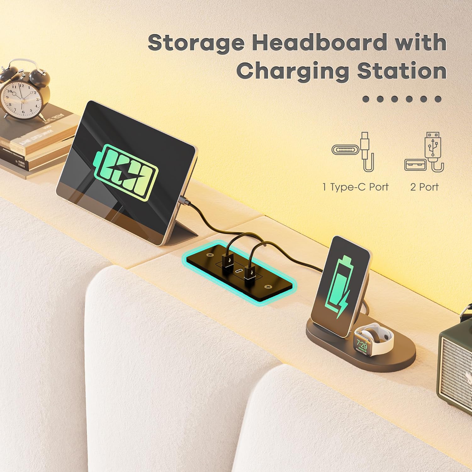 - Built-In Charging Station & Shelf: The integrated shelf on the headboard keeps essentials within easy reach—perfect for placing your phone, e-reader, water glass, or bedside book. No more fumbling for chargers in the dark; the built-in USB ports allow you to keep devices powered up right where you need them.