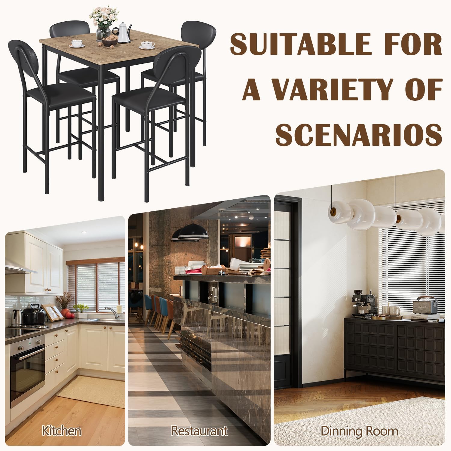 This dining set excels in environments where space efficiency meets style. Whether you live in a small apartment, a studio kitchen, or a cozy breakfast nook, this set offers a complete seating solution that doesn’t sacrifice design. The counter-height configuration allows it to double as a kitchen island alternative when additional prep or serving space is needed. It’s equally effective as a functional home office desk for two, enabling focused work or virtual meetings with room for laptops and notebooks.