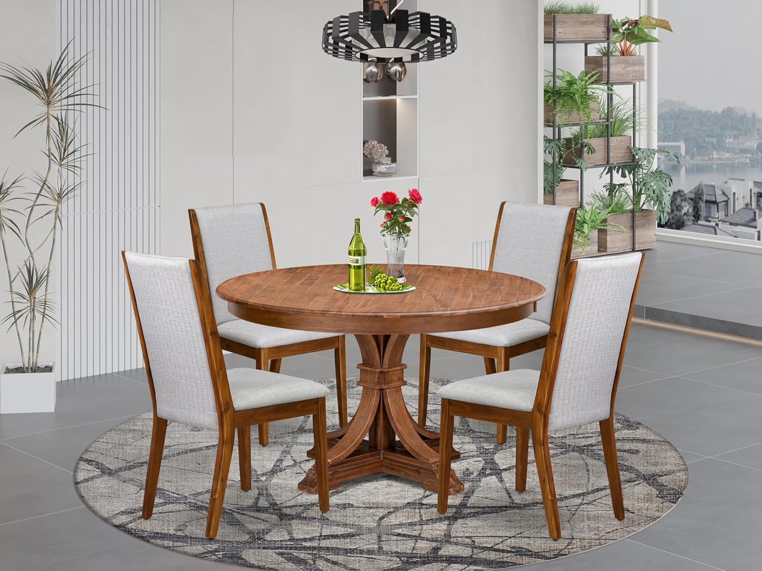 The Luxe by East West Furniture F7LA5-50N-05 is a 5-piece mid-century dining set that masterfully combines timeless design with modern functionality. This complete set features one solid Rubber Wood dining table and four matching high-back chairs, all finished in a warm antique walnut tone. Upholstered in soft grey linen fabric, the chairs offer both comfort and elegance, making this set ideal for daily family meals or special occasions. With its clean lines and sophisticated aesthetic, this dining ensemble enhances any contemporary or transitional interior while maintaining durability and long-lasting appeal.