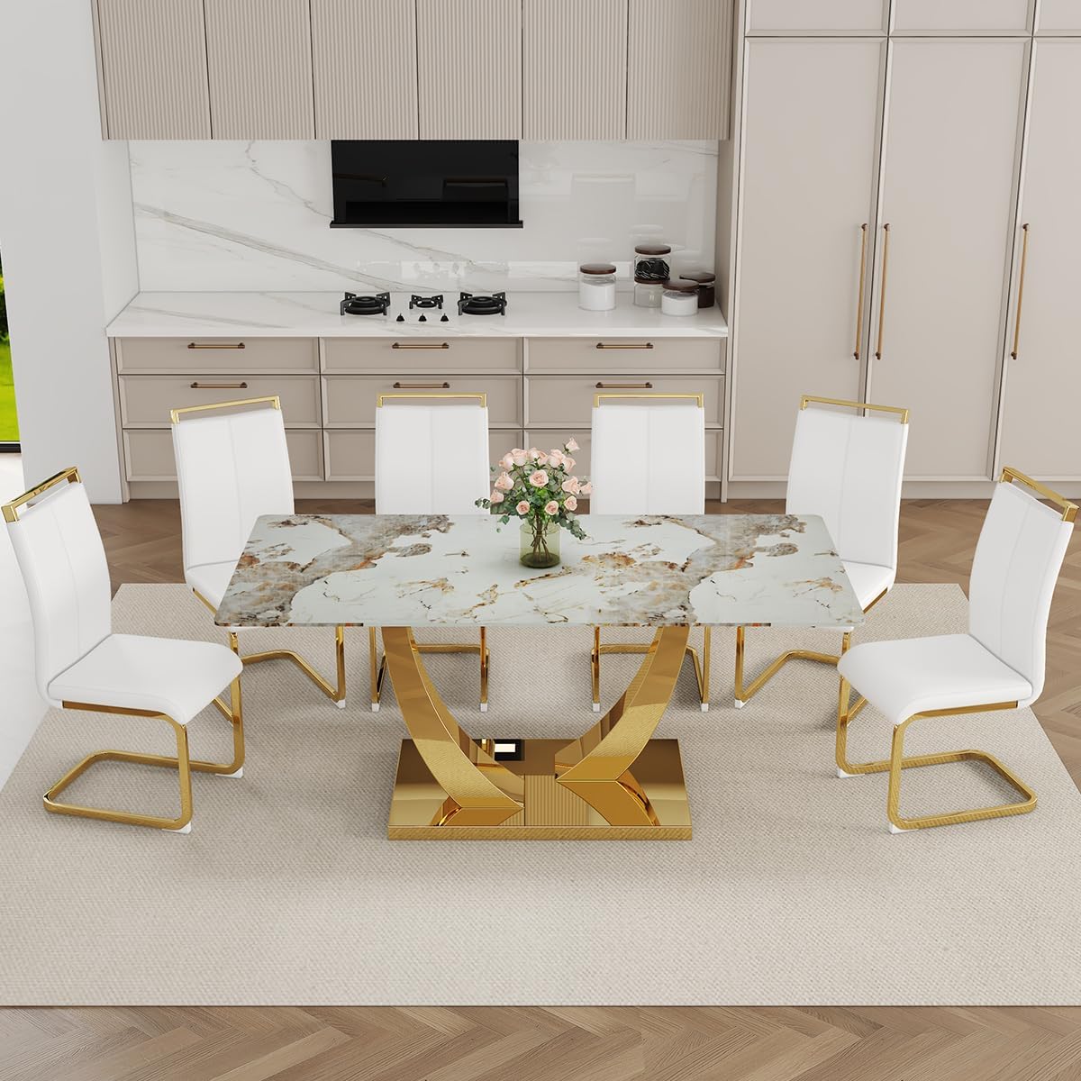 This luxurious faux marble dining table set is designed for six guests and features a modern, elegant design perfect for contemporary dining spaces. The set includes one 71-inch rectangular dining table with a glossy faux marble top and two gold metal legs, complemented by six white PU leather upholstered chairs. Ideal for both everyday meals and special occasions, this set blends sophistication with practicality. Its tempered glass construction ensures durability while maintaining a sleek, high-end appearance. Whether used in a kitchen or dining room, this set enhances any space with its blend of style and comfort.