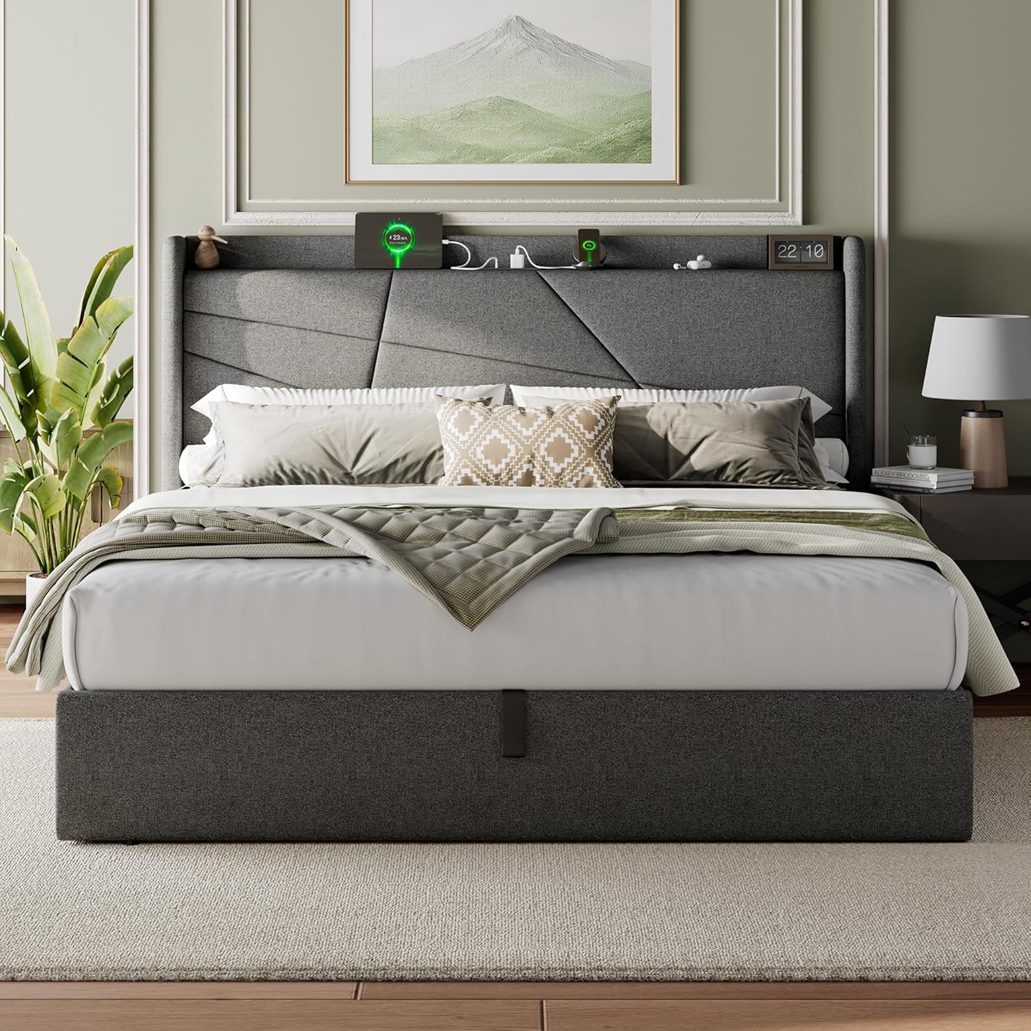 The Feonase King Size Lift Up Storage Bed Frame with Charging Station redefines bedroom functionality by blending elegant upholstery with intelligent space-saving design. This modern platform bed features a hydraulic lift system that effortlessly raises the mattress to reveal a generous 10.8-inch storage compartment, ideal for stashing extra linens, seasonal clothing, or bulky items that tend to clutter living spaces. Beyond its practical storage, the bed includes an integrated charging hub in the wingback headboard, complete with two AC outlets, a USB-A port, and a Type-C port—perfect for overnight device charging without relying on extension cords or power strips. Constructed with durable wooden slats, the frame supports up to 1000 lbs and eliminates the need for a box spring, simplifying setup and enhancing long-term durability. Enhanced with noise-reducing foam, the bed ensures quiet operation even when adjusted or sat upon, making it especially suitable for light sleepers or shared bedrooms. Finished in a sophisticated dark gray upholstery, this bed complements contemporary décor while delivering essential utility for urban homes, small apartments, dorm rooms, or any space where maximizing floor area matters.