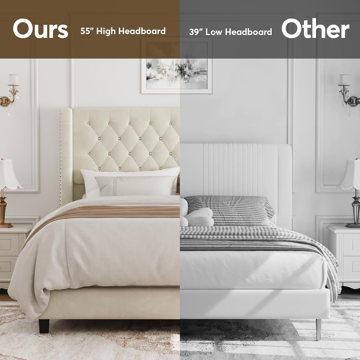 Full Bed Frame with 55″ Tall Headboard, Upholstered Bed