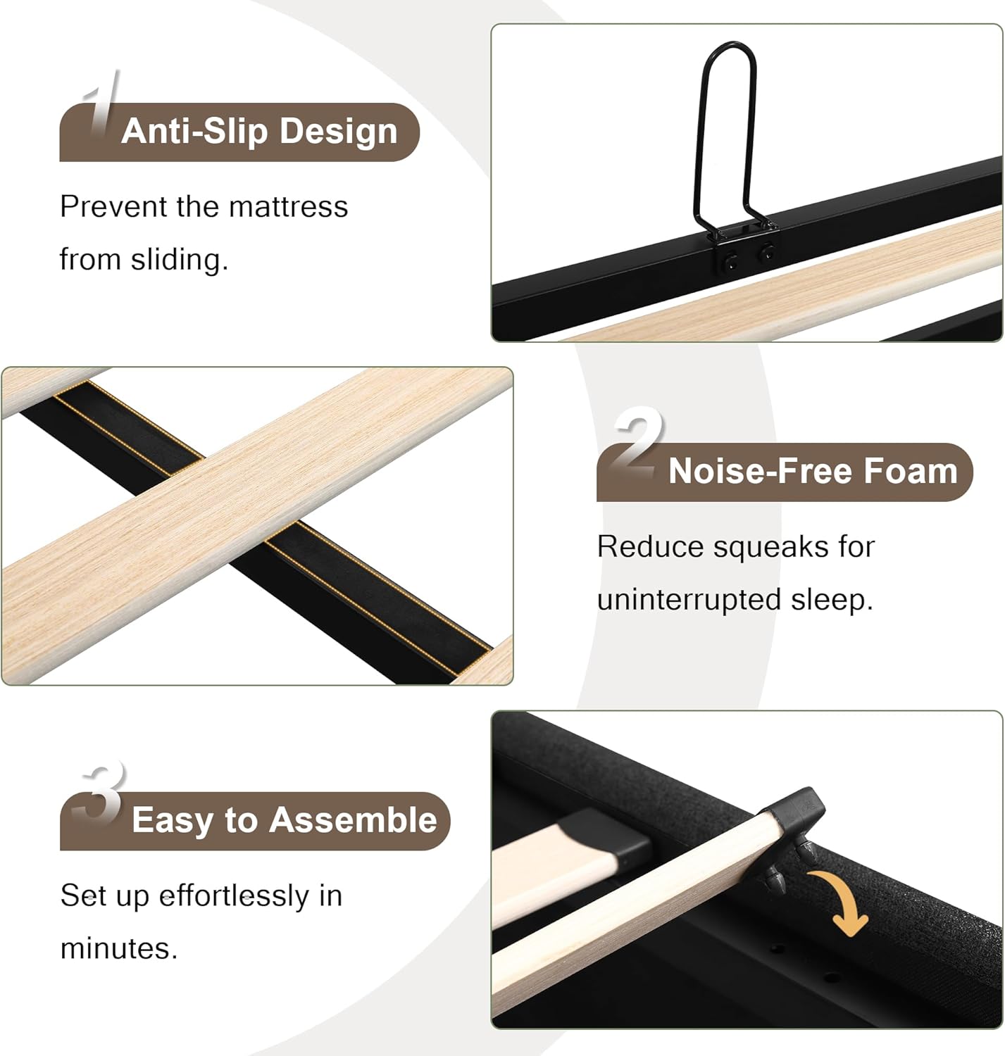 • Solid Wooden Slat Support: Constructed with durable wooden slats, the bed provides consistent, reliable support across the entire sleeping surface. These slats promote proper airflow beneath the mattress and eliminate sagging, helping to extend the life of your mattress. No box spring is needed—just place your mattress directly on the slatted base for optimal stability and comfort.