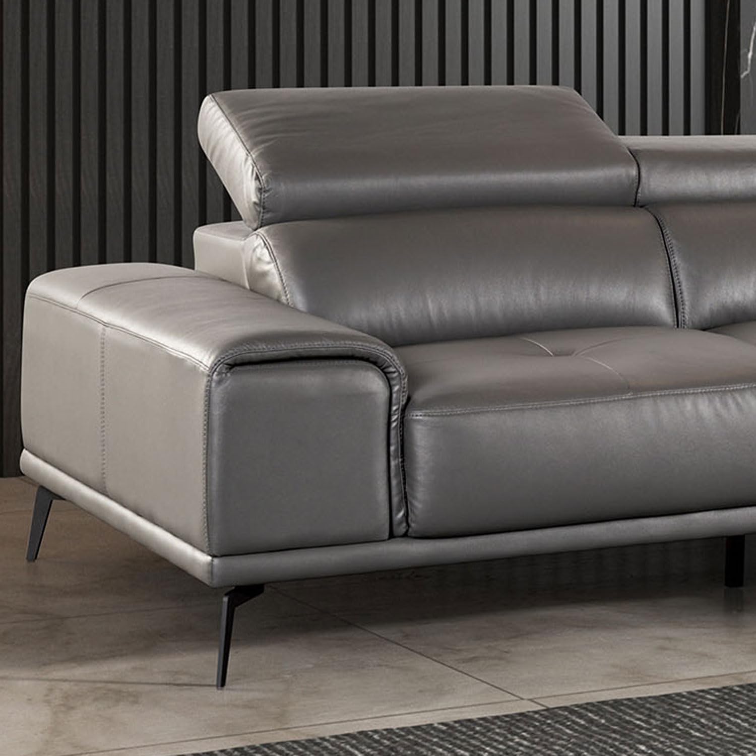 The dark gray leather match upholstery is not only stylish but also practical—resistant to spills and easy to wipe clean, making it suitable for households with children or pets. Unlike full-grain leather, which can show scratches easily, leather match maintains a consistent appearance and durability over time. The biscuit tufted cushions ensure that the sofa retains its plush feel without sagging, even with frequent use.