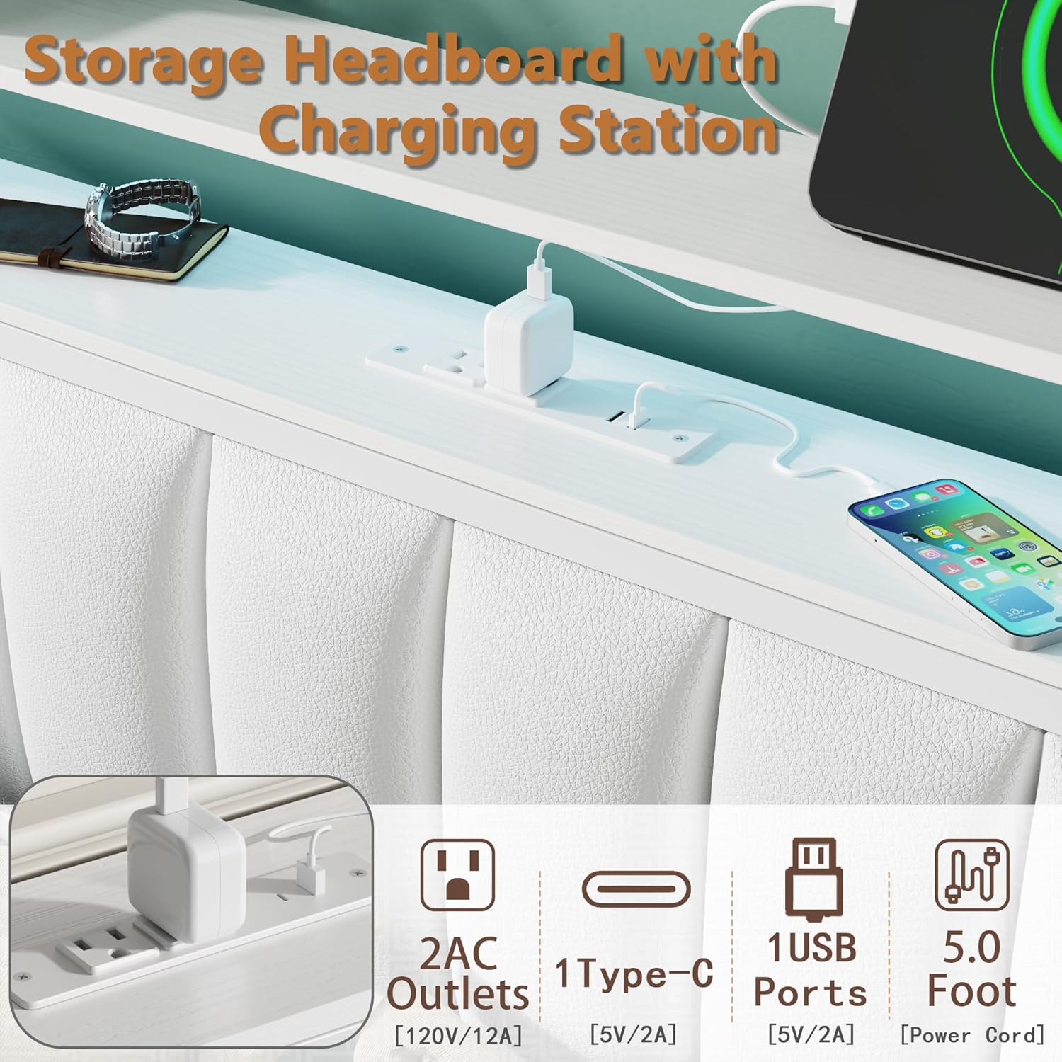 - Integrated Charging Station: Features multiple USB ports and standard AC outlets directly built into the frame, allowing seamless charging of phones, tablets, lamps, or other electronics right beside your bed—no need for extra power strips.