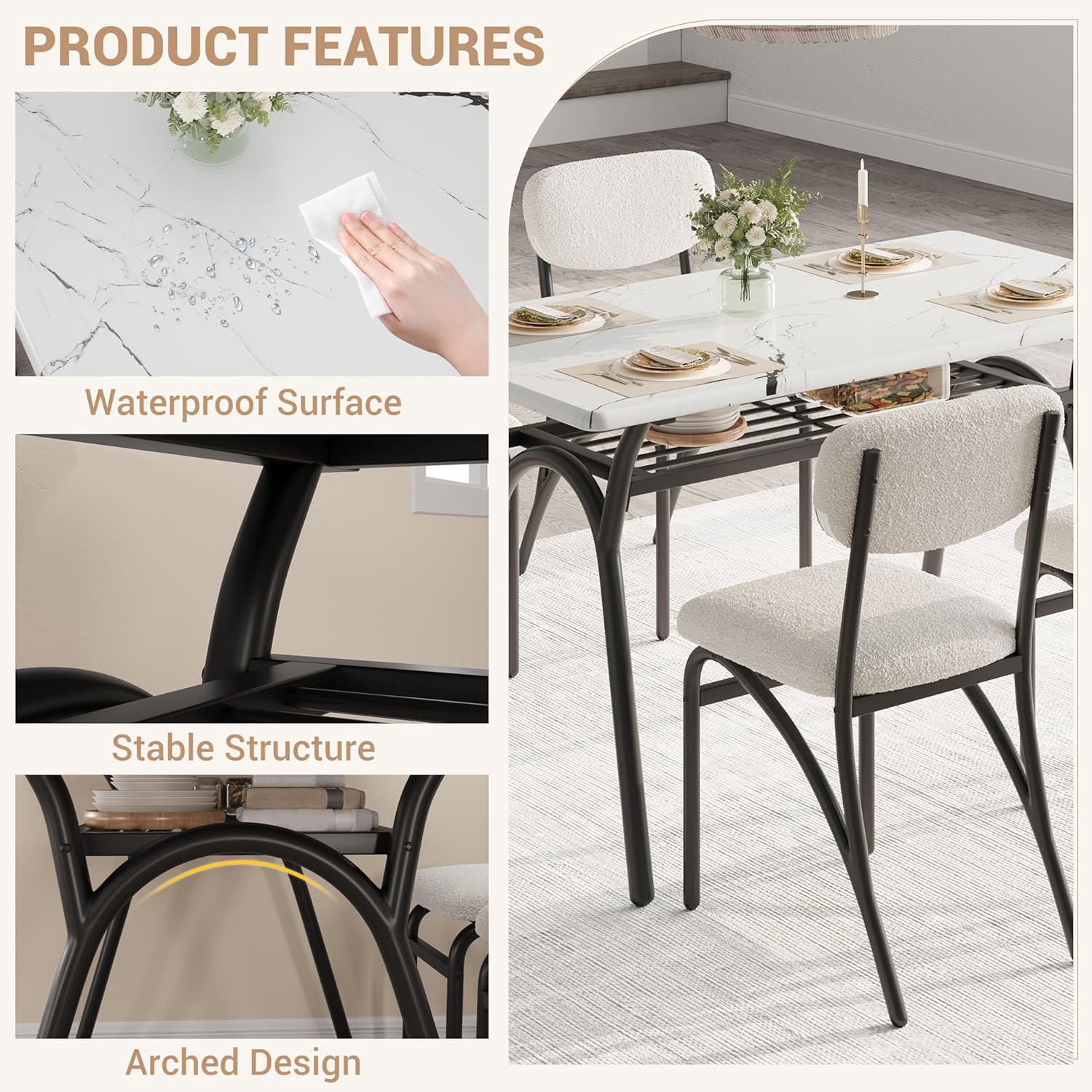 - Material: Marble-look tabletop, boucle fabric chairs, metal/wood frame [implied but not detailed]