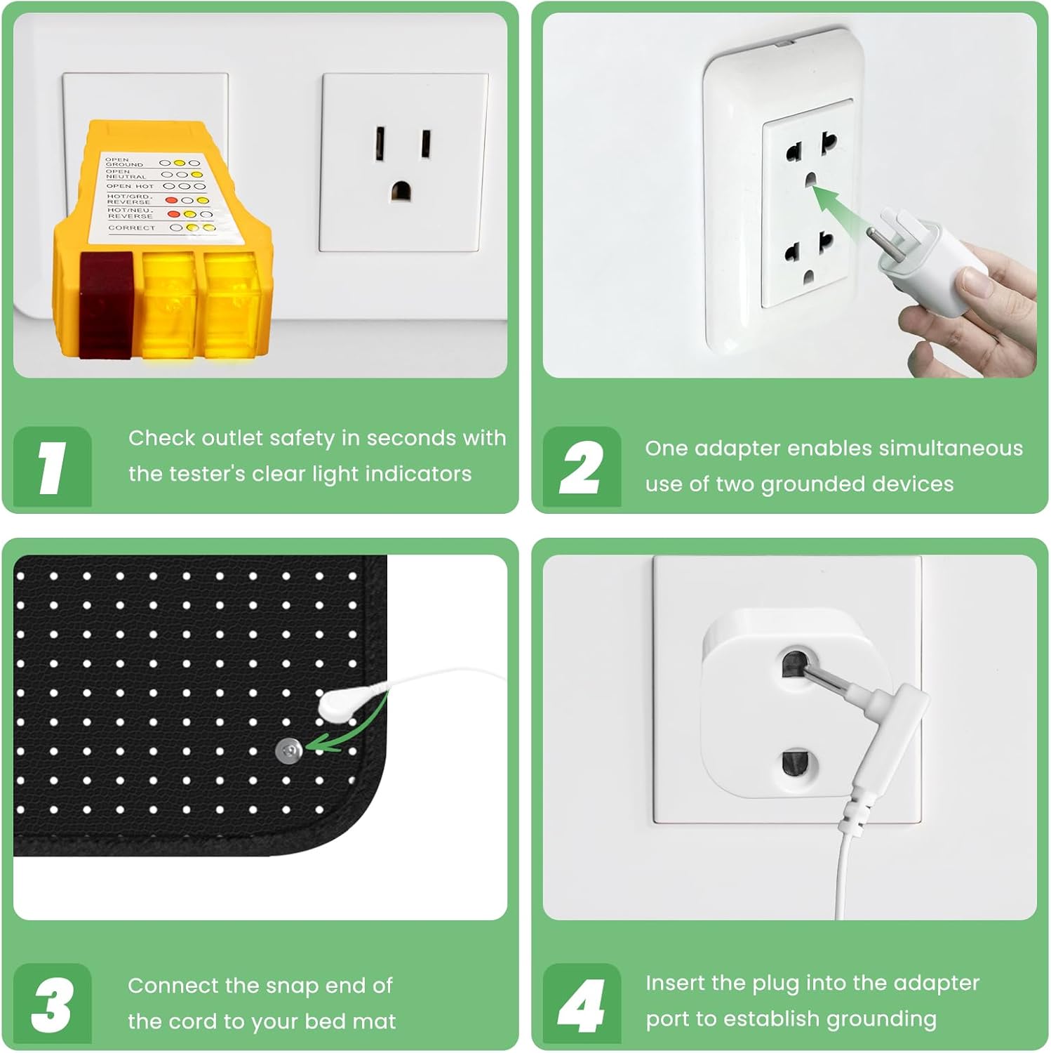 - Included Components: One grounding mat, one grounding cord (with alligator clips), one wall adapter (for U.S. standard outlets), and one built-in outlet tester.