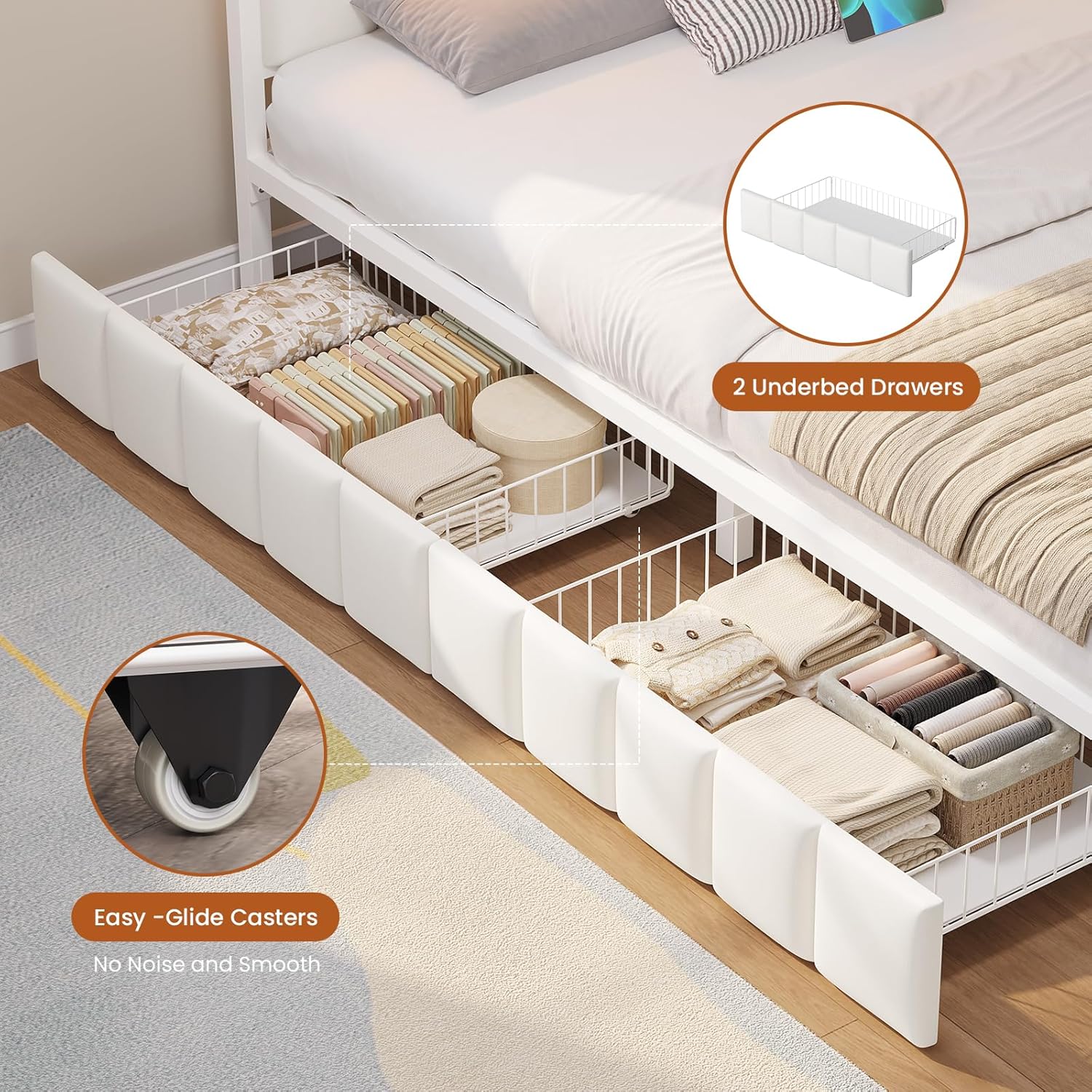 - Dual Underbed Storage Drawers: The two deep sliding drawers offer generous storage capacity without taking up valuable floor space. They’re perfect for stowing away extra pillows, blankets, out-of-season clothes, or kids’ toys, making them especially useful in compact bedrooms or guest rooms.