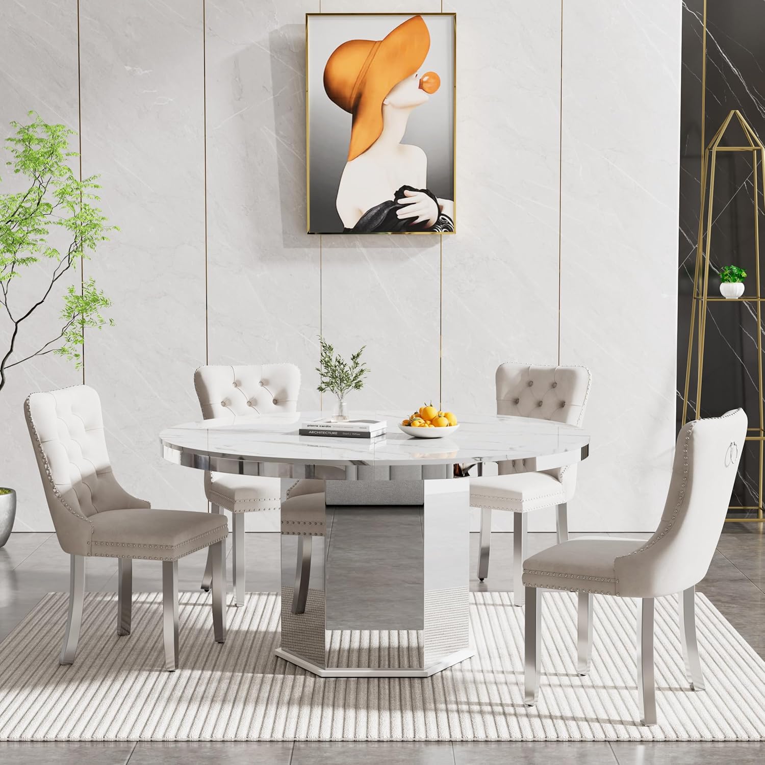 This modern dining table set is thoughtfully designed to deliver both elegance and efficiency in compact living spaces. Perfect for small apartments, condos, or open-plan rooms, the 47″–63″ expandable round/oval faux marble table adapts effortlessly from a cozy two-person setting to a spacious arrangement accommodating four guests. The set includes four plush velvet upholstered chairs, each featuring a sleek silver mirrored base that adds a reflective, airy touch to the overall design. Whether used for casual family meals, dinner parties, or everyday dining, this space-saving solution combines contemporary style with practical functionality—making it an ideal choice for urban dwellers who value both form and function.
