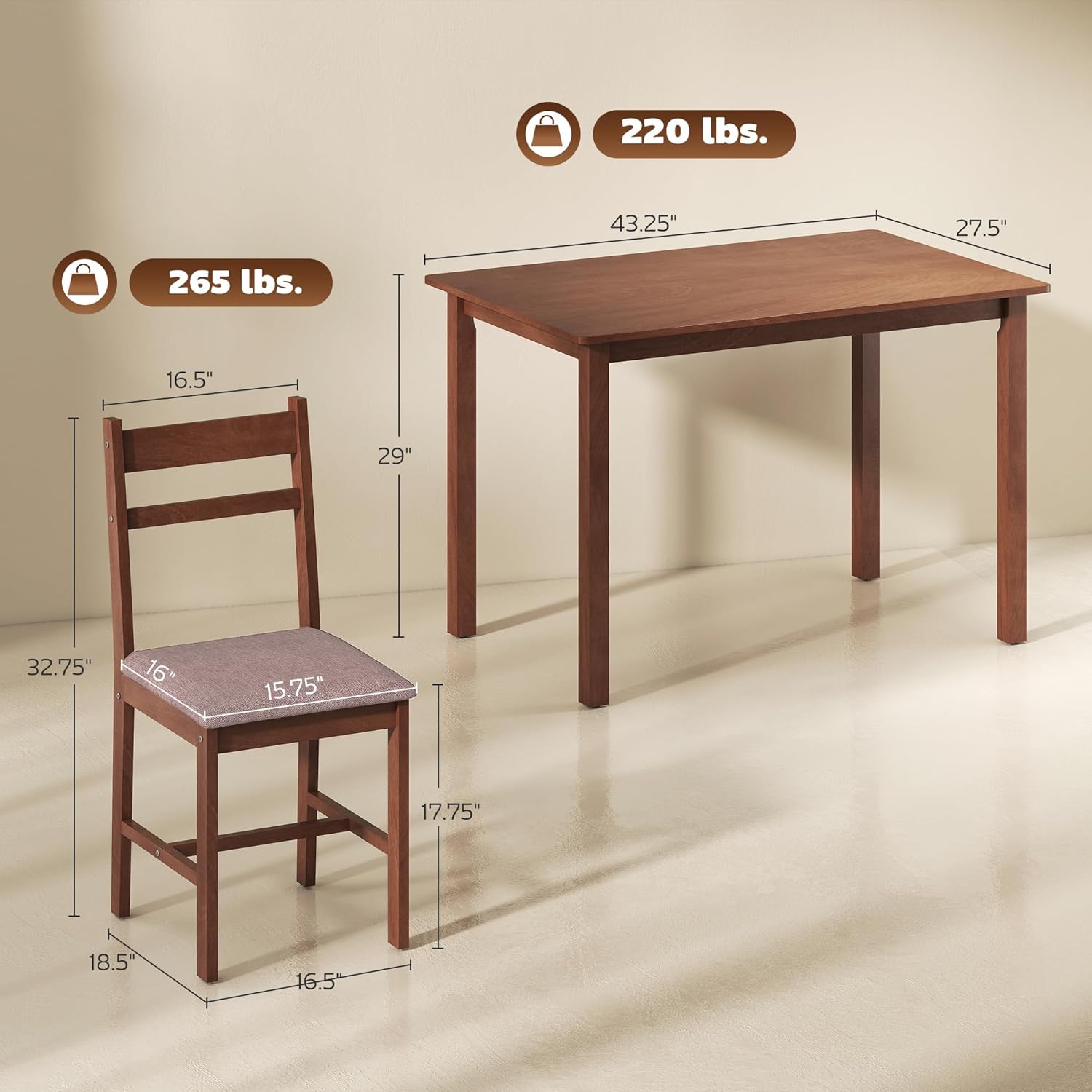 Crafted from durable materials, the table supports up to 220 lbs. while each chair holds up to 265 lbs., ensuring long-term stability and reliability. Whether used for breakfast nooks, casual dinners, or hosting friends, this set delivers a cozy atmosphere without sacrificing functionality.
