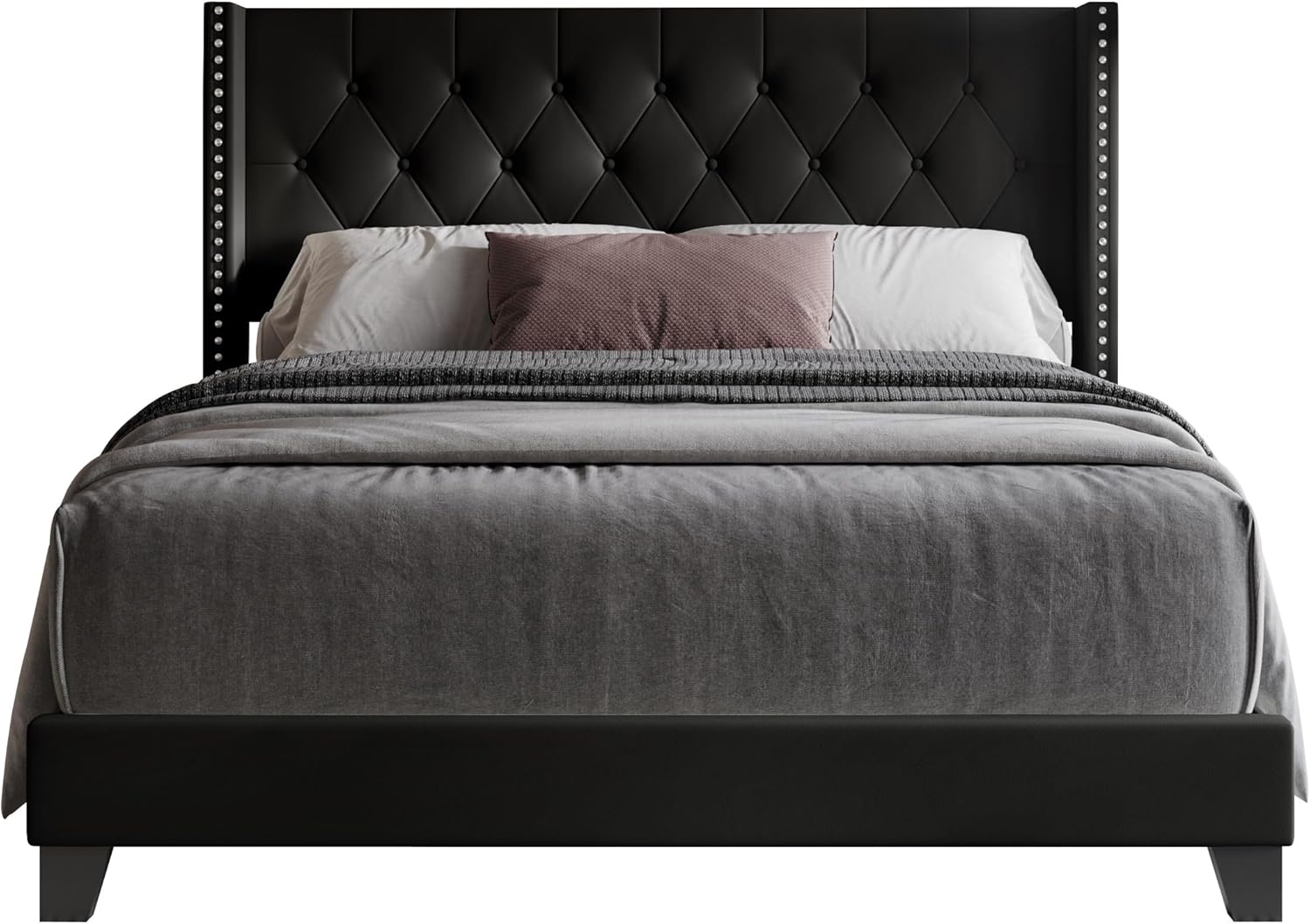 The HOME DESIGN Homer Queen Tufted Wingback Upholstered Panel Bed Frame is a masterful blend of timeless design and modern functionality, crafted to elevate the aesthetic and comfort of any bedroom. With its commanding presence and luxurious detailing, this bed frame serves not only as a stylish centerpiece but also as a practical piece of furniture ideal for everyday living. The tall wingback headboard is meticulously designed with deep diamond button tufting and sparkling nailhead trim, evoking the elegance of high-end upholstery found in boutique hotels and designer interiors. Upholstered in rich black faux leather, the bed exudes sophistication while remaining durable and easy to maintain—perfect for homes where style meets daily utility.