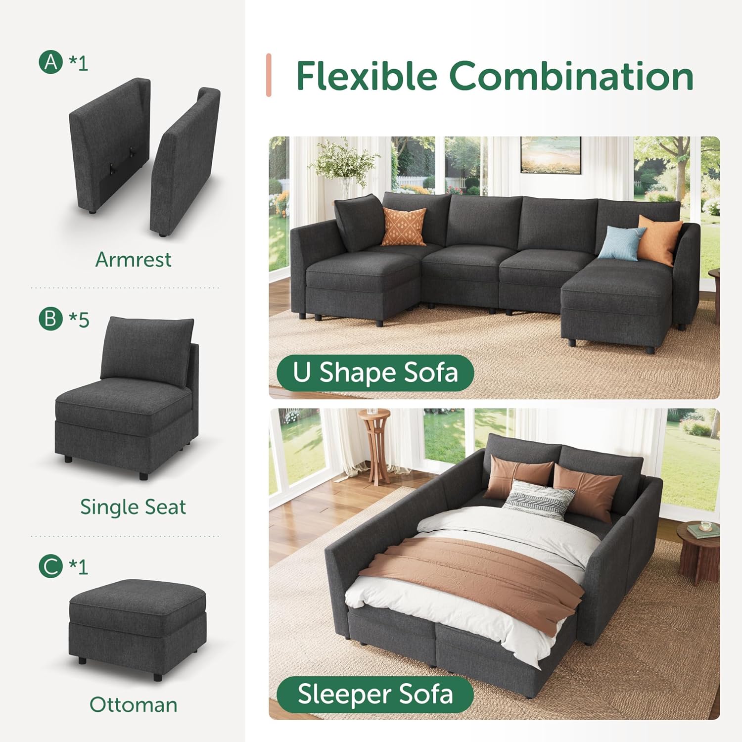 - Sturdy and Durable Construction: Engineered for long-term use, the frame and structure support everyday wear and frequent reconfiguration, ensuring stability and reliability over time. High-density foam cushions provide consistent comfort, even after repeated adjustments and daily use.