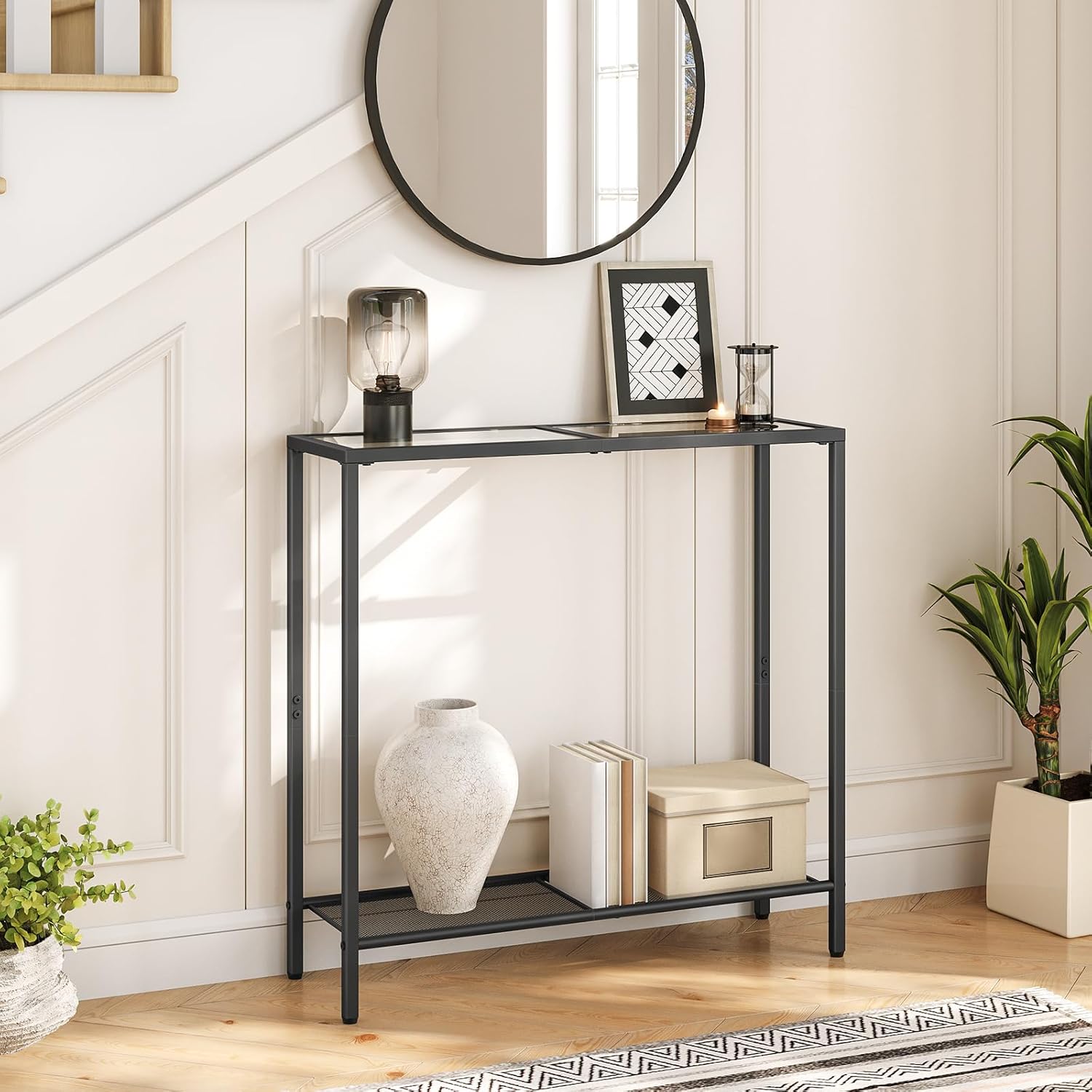 Convenient Storage: The 2-tier glass entrance table offers ample storage space. Its top can hold keys, sunglasses, etc. for easy access. The bottom is a spot for larger items like shoes, umbrellas, and more, keeping your entryway neat and attractive