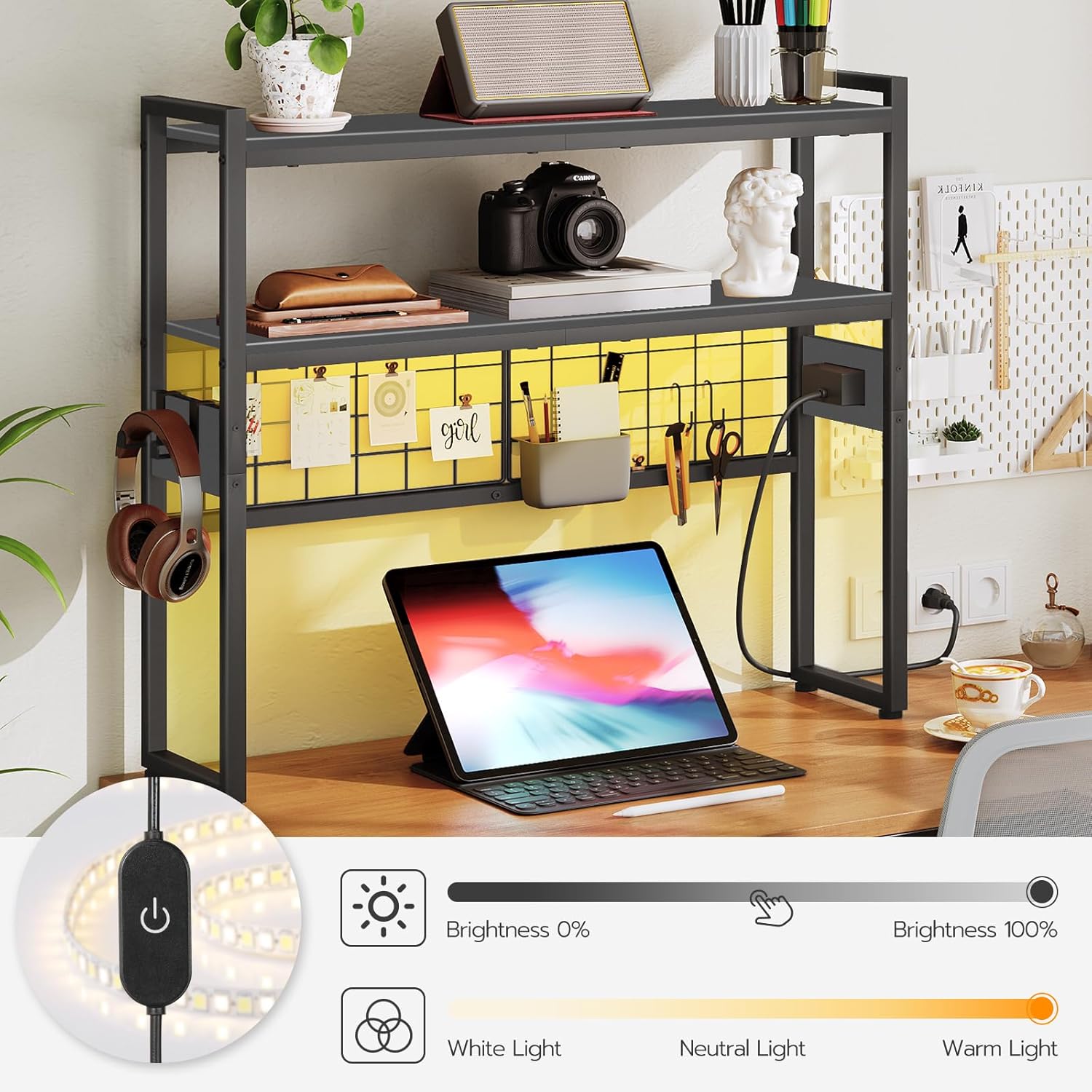 3-Color Light Strip: The desk organizer shelf features an adjustable LED light strip that offers cool, warm, and white lighting options. You can customize the brightness to suit your needs, whether you’re reading, working on the computer, or playing games