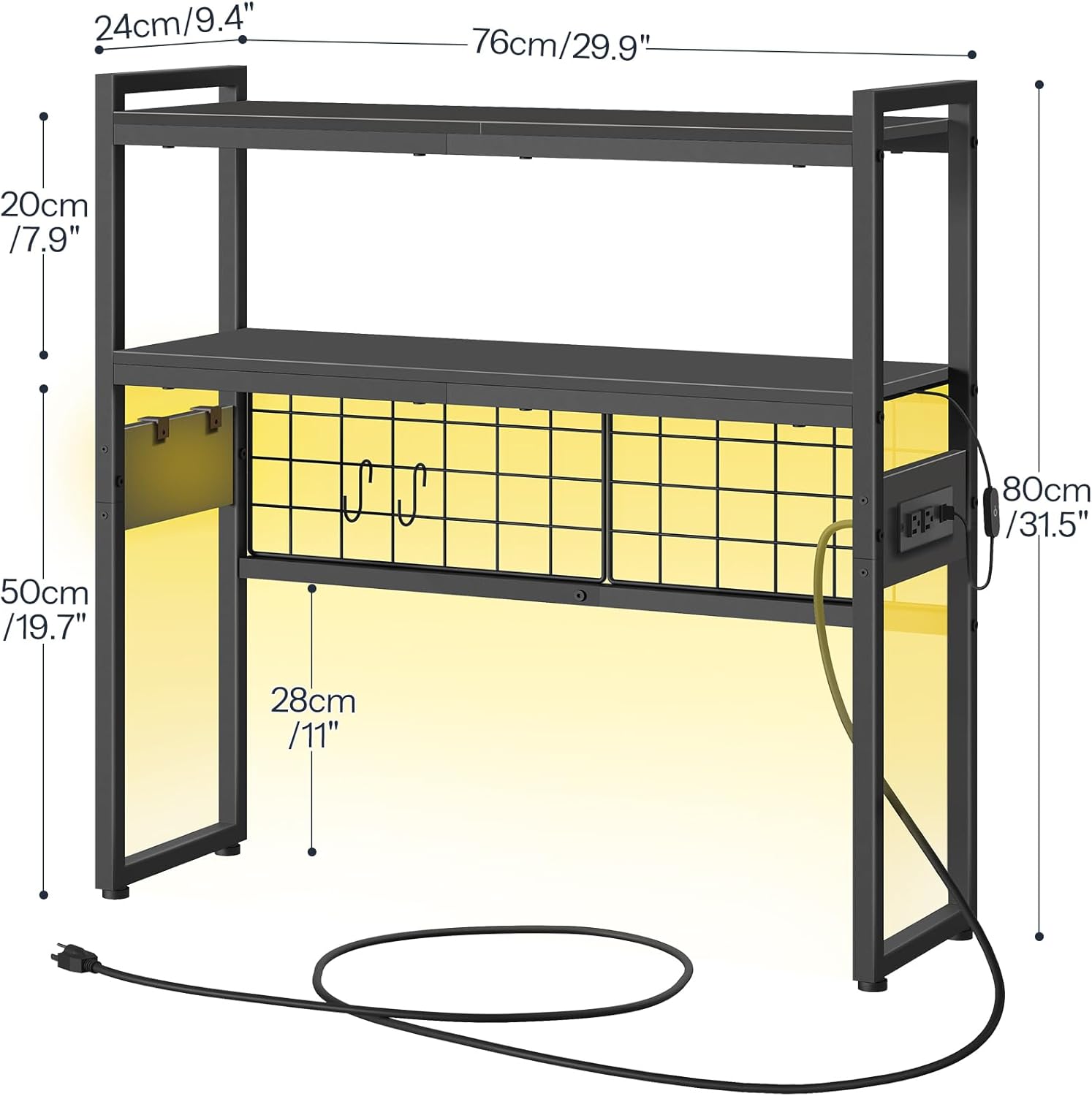 HOOBRO desktop bookcase solves your worries. With a double-lay storage shelf and a power outlet, it is perfect for use in multiple settings, including an office desk, dressing table, game room or balcony. The adjustable three-color light strip offers ample brightness, while the side power strip allows for charging without tangled wires.