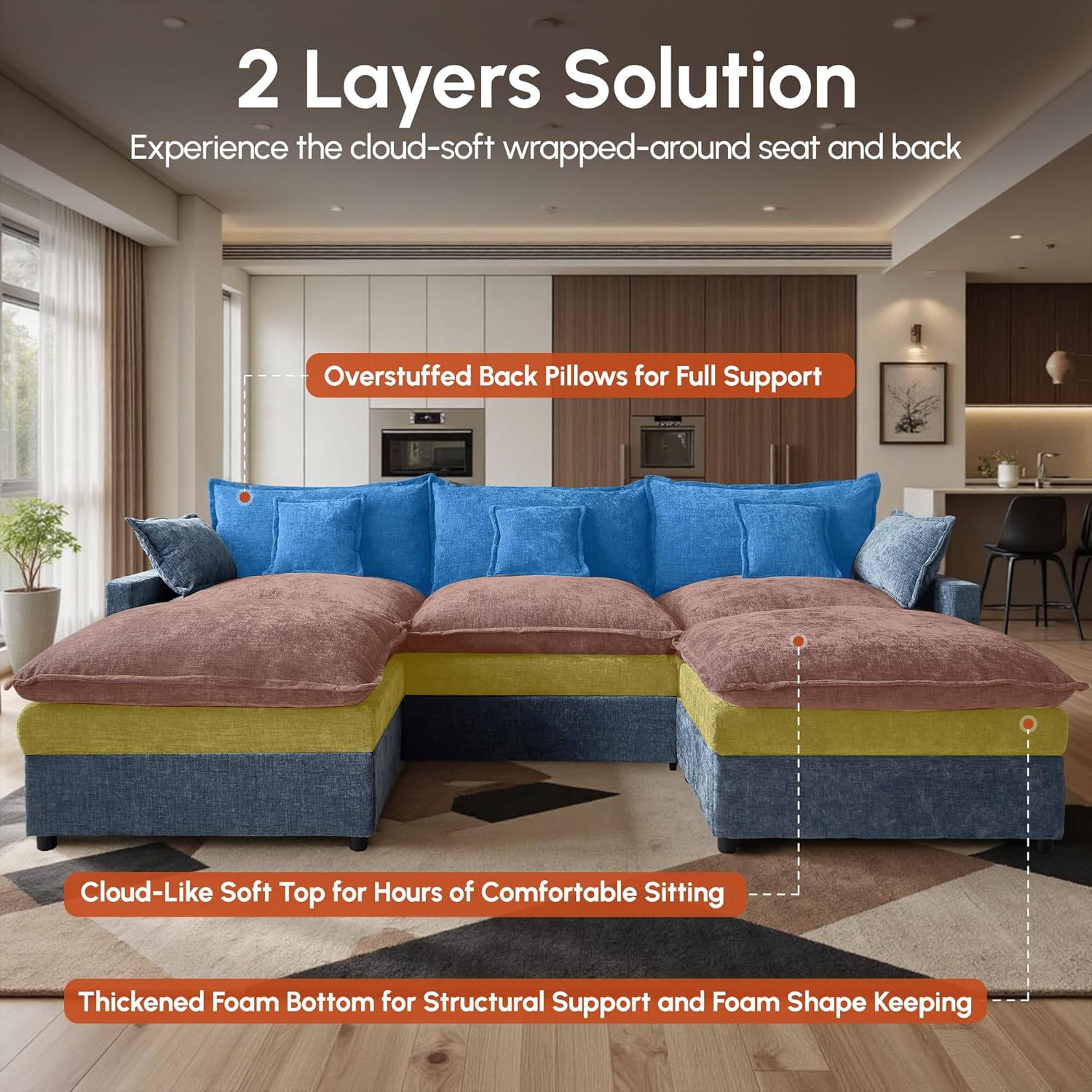 The HOOOWOOO 108 Inch U Shaped Cloud Couch is a modern, oversized 5-seater sectional sofa designed to bring both comfort and contemporary style to your living space. Whether you’re furnishing a cozy apartment, updating a family room, or adding seating to a bedroom lounge, this sofa delivers a luxurious lounging experience with its plush chenille upholstery and deep, pillow-top cushions. The generous 108-inch length creates a wraparound layout that comfortably seats up to five people, making it perfect for movie nights, casual hangouts, or relaxing with loved ones. With two included movable ottomans, you can easily customize the configuration to suit your room’s layout and personal preferences. Available in six vibrant colors, this sofa blends effortlessly into various interior styles while offering lasting durability and visual appeal.
