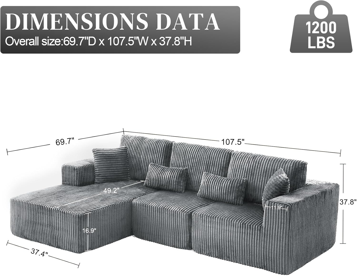 The HYJT-H&K Modular Sectional Sofa Cloud redefines comfort and convenience in modern living. This luxurious L-shaped sectional combines deep, supportive seating with a plush corduroy finish to create an inviting centerpiece for any room. Designed with versatility and ease of use in mind, this 107-inch sofa features a left-facing chaise and a modular boneless construction that makes setup effortless—no tools, hardware, or assembly required. Simply unbox, gently tap each segment to activate its springiness, and enjoy instant readiness within minutes. Over the next 72 hours, the memory foam cushions will fully expand, reaching optimal plushness and comfort.