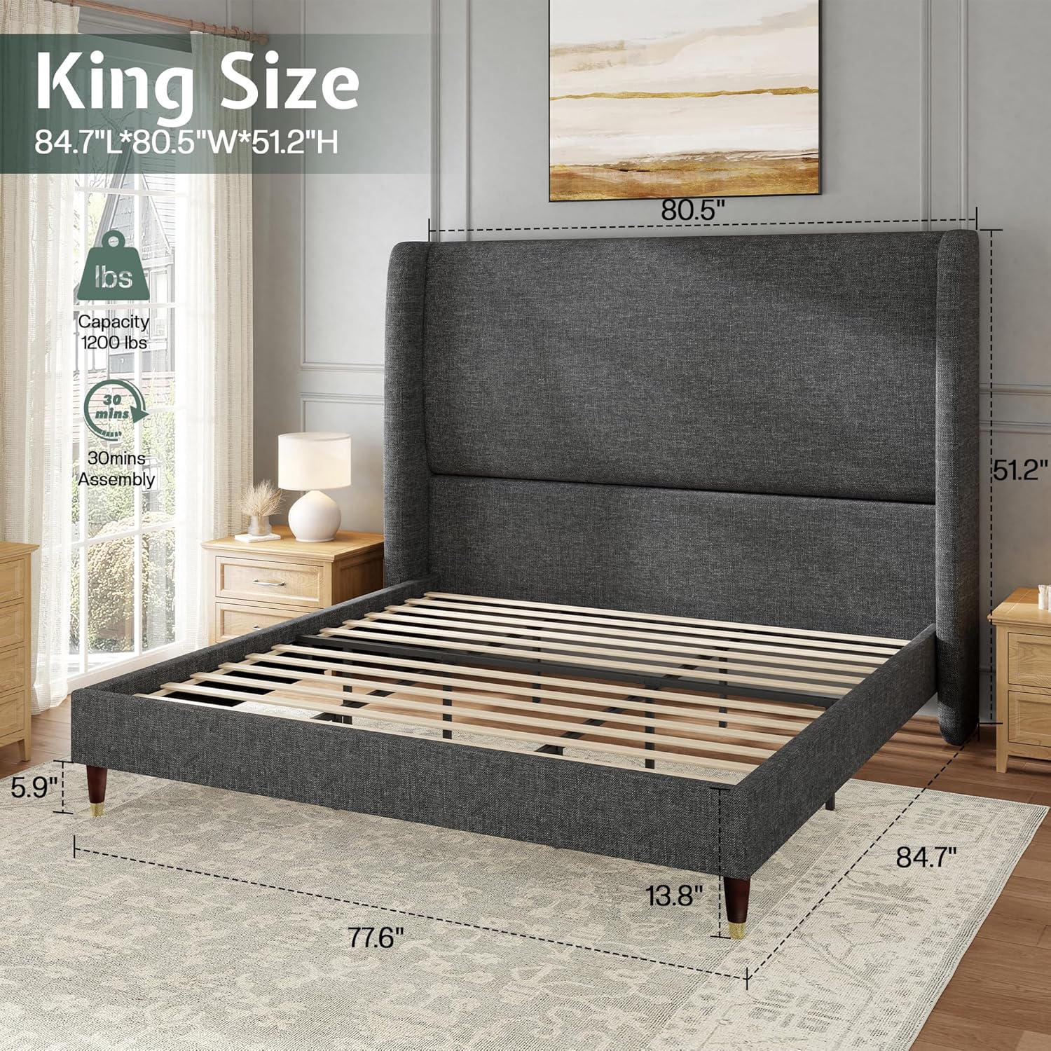 13 reviews for Jocisland King Size Bed Frame 51.2″ Wingback Headboard Linen