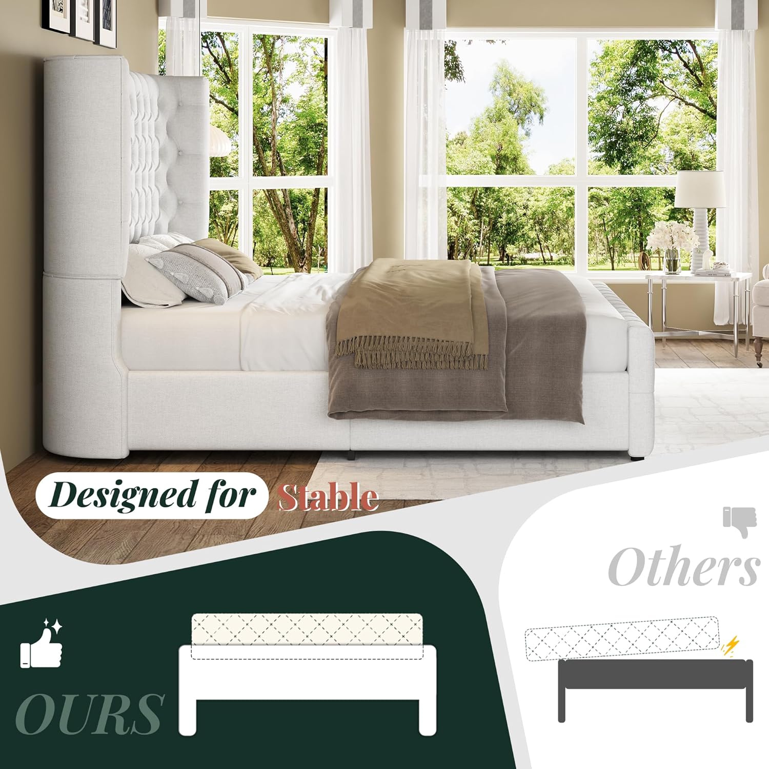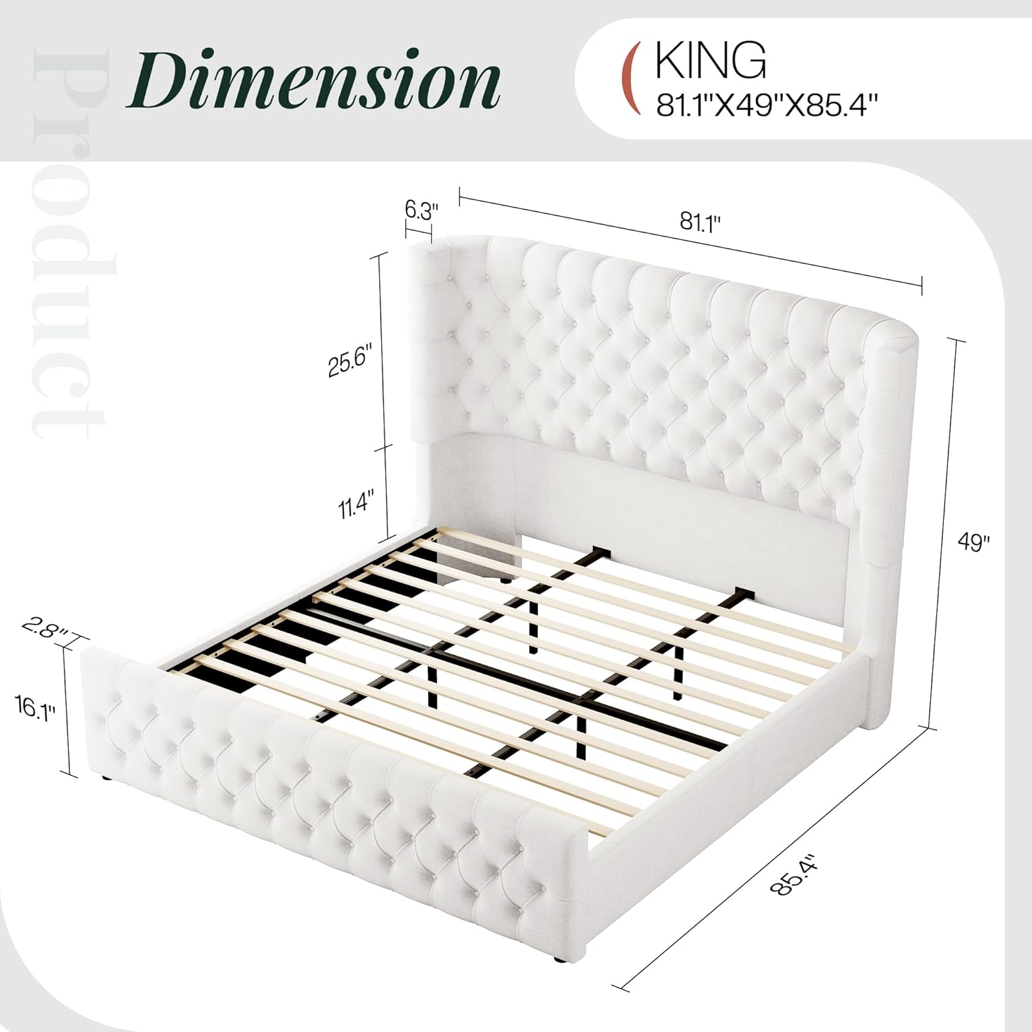 The Jocisland King Size Platform Bed Frame combines luxury, functionality, and modern design in one elegant package. Featuring a 6.3-inch thick upholstered curved wingback headboard and matching footboard, this bed offers both aesthetic appeal and lasting comfort. Crafted with deep button tufting and finished in a crisp white linen fabric, it serves as the centerpiece of your bedroom without requiring a box spring. Designed for effortless assembly and everyday durability, this platform bed is ideal for those who appreciate style, support, and simplicity.