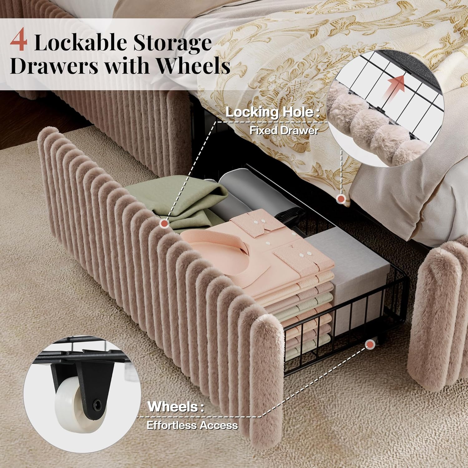 - Number & Size of Drawers: Four large under-bed drawers; each approx. 30″ W x 16″ D x 9″ H