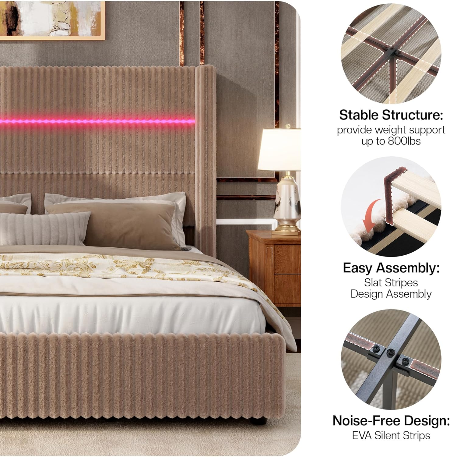 The Jocisland Queen Size Corduroy Upholstered Bed Frame is a thoughtfully designed sleep solution that blends comfort, style, and practicality into one elegant package. Featuring a rich brown corduroy upholstery and a commanding 51.2-inch tall wingback headboard, this bed makes a striking centerpiece in any bedroom while delivering exceptional functionality. Built for queen-sized mattresses, it includes four spacious under-bed storage drawers to help keep your space organized without the need for extra furniture. With integrated LED lighting along the headboard and a built-in charging station complete with USB ports and AC outlets, this bed supports both relaxation and modern connectivity—ideal for today’s tech-savvy homeowner.