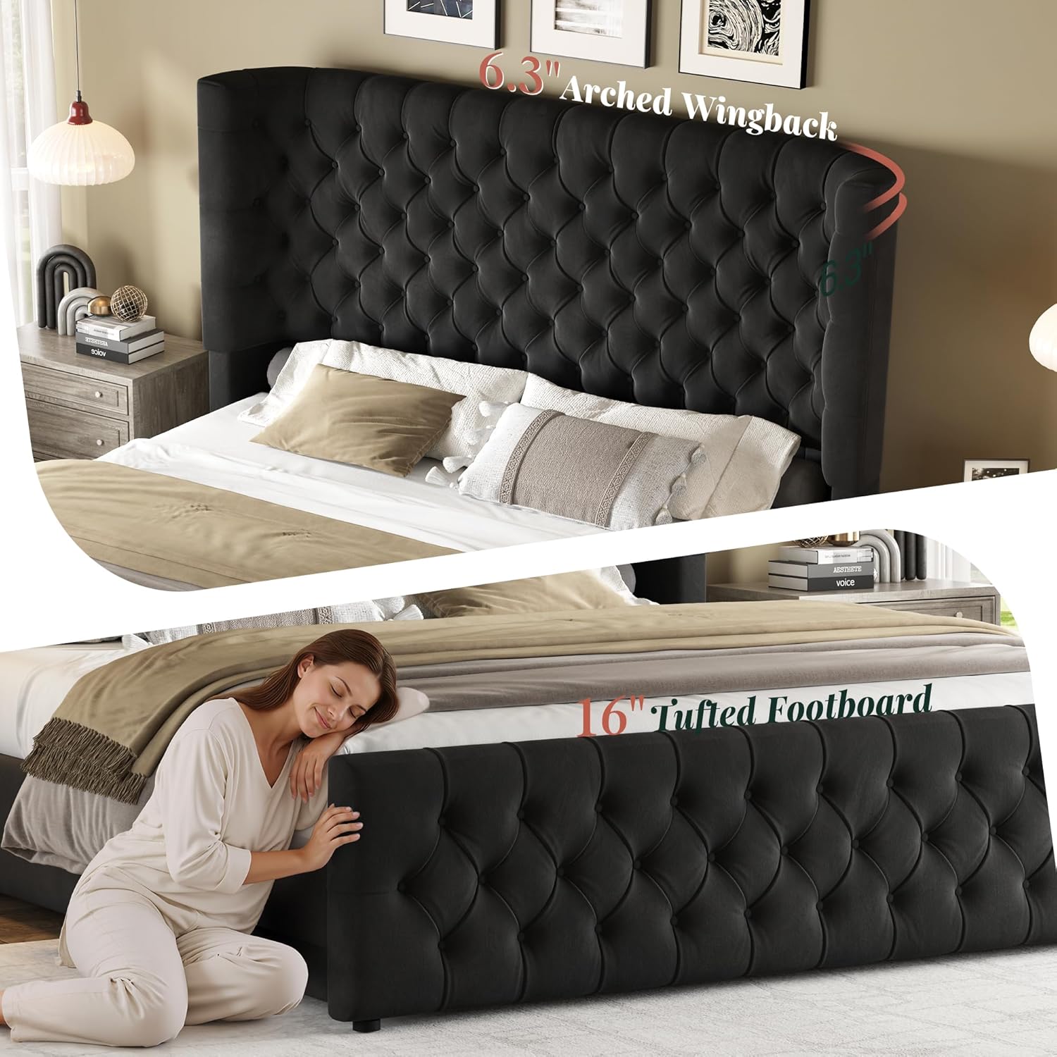 - 6.3″ Thick Upholstered Headboard and Footboard: Generously padded with high-density foam, this bed frame delivers plush comfort that cradles your back and neck. Whether you’re curled up with a book or watching TV, the thick cushioning offers cloud-like softness without compromising structural integrity.