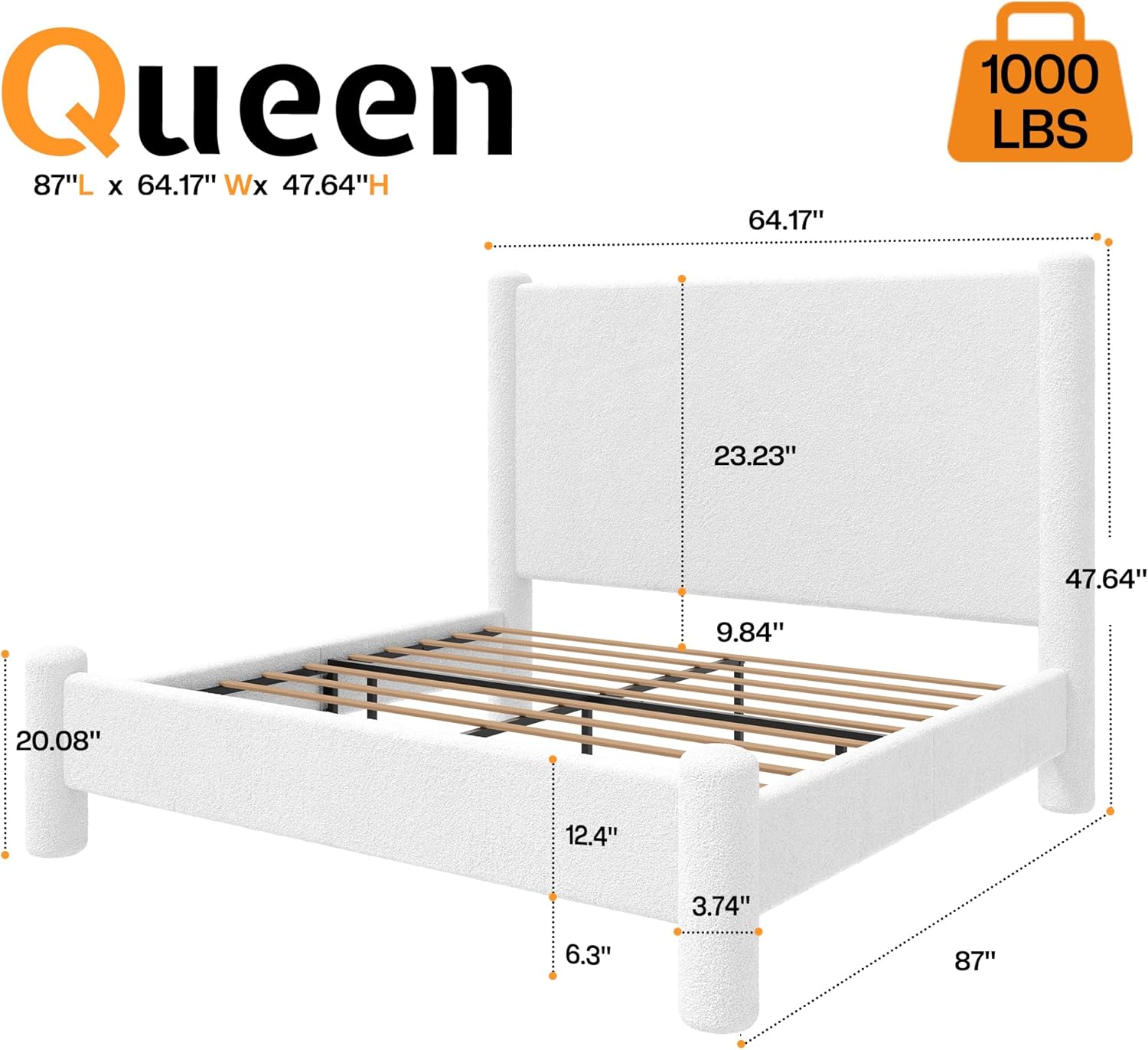 The package includes all necessary components for assembly, such as bolts, brackets, and step-by-step instructions, though specific details on individual parts are not provided. Customers should verify that their mattress measures approximately 60 inches by 80 inches (standard queen size) to ensure a proper fit. While the bed is constructed for durability, it’s recommended to avoid placing excessive weight or pressure on the headboard beyond normal use. Over time, the boucle fabric may require gentle brushing or vacuuming with a soft brush attachment to maintain its texture and loft. Avoid harsh chemicals or abrasive tools when cleaning to preserve the fabric’s integrity.