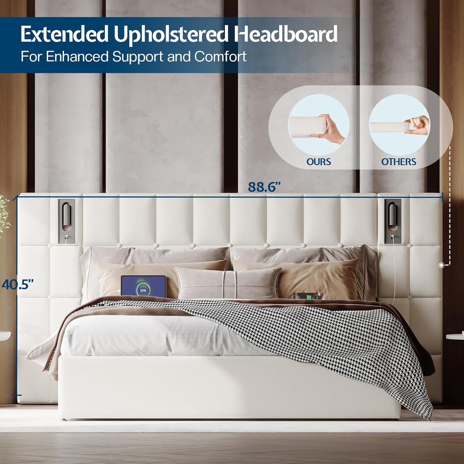 The Jocisland Queen Size Upholstered Bed Frame redefines bedroom elegance with its luxurious velvet finish and smart, space-saving design. This platform bed combines a bold, extended headboard with practical storage solutions and modern amenities—making it perfect for those who value both style and functionality. Whether you’re furnishing a master suite or a compact guest room, this bed delivers comfort, convenience, and contemporary charm in one cohesive package. The neutral cream upholstery complements a wide range of interior styles, while the sturdy construction ensures long-lasting performance.