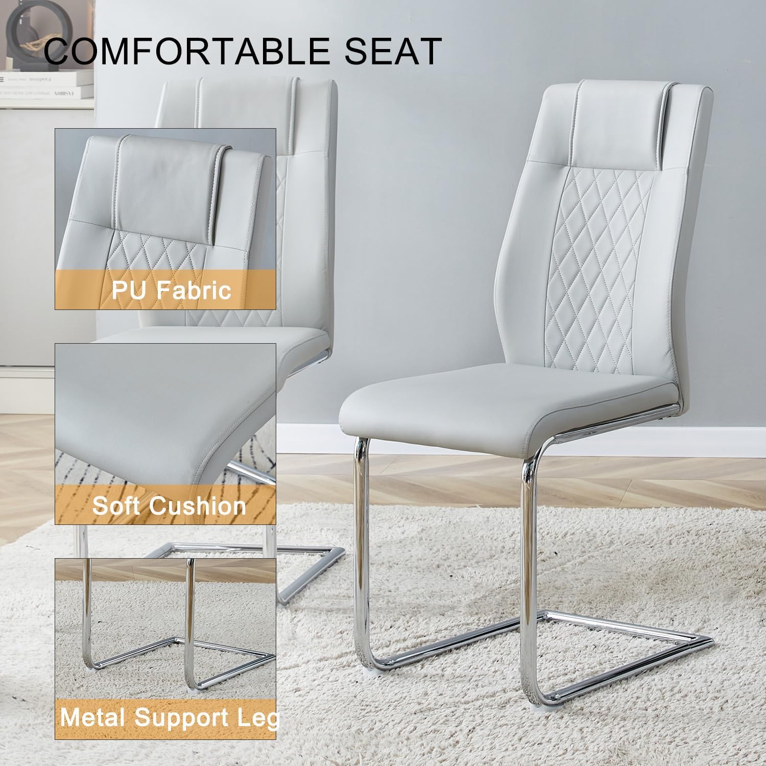 - Premium PU Leather Cantilever Chairs: Four ergonomically designed chairs feature soft, durable PU leather seats in coordinating light grey, offering comfort and a modern silhouette that complements the table’s contemporary lines.