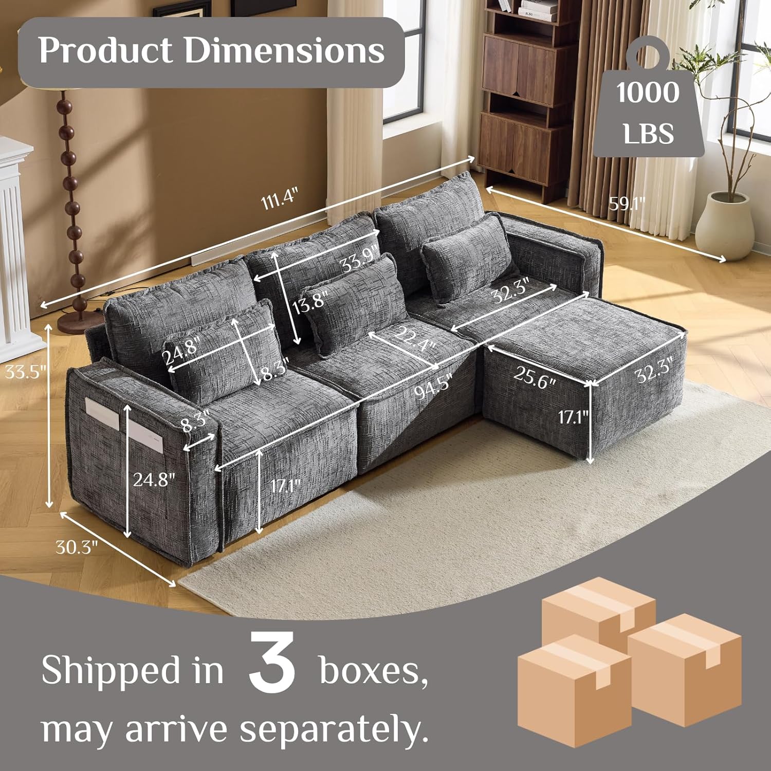 Crafted with premium chenille upholstery, the couch delivers a soft, cloud-like texture that invites relaxation. The neutral gray tone complements any décor, making it a versatile centerpiece for contemporary, minimalist, or cozy interiors. With three generous seat cushions and six accent pillows included (three standard back pillows plus three bonus), every inch of this 110-inch-long sofa offers plush support and visual balance.