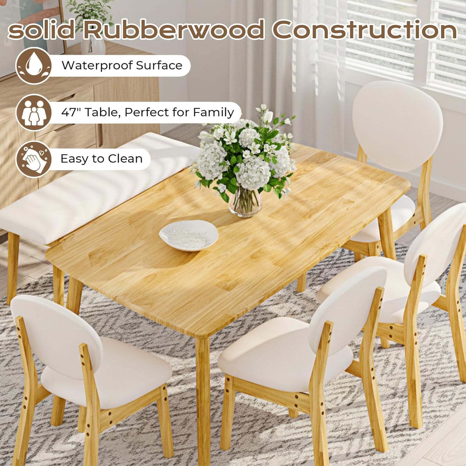 The Karl Home Wood Dining Table Set for 6 is a thoughtfully designed, space-efficient dining solution that brings both style and function to kitchens, small apartments, or compact dining areas. This mid-century modern 6-piece set features a solid wood table paired with four upholstered chairs and an integrated bench seat, offering flexible seating for up to six people. Built with premium AA-grade solid wood throughout the tabletop and frame, the set delivers lasting durability, natural warmth, and timeless appeal. Its compact footprint makes it ideal for urban living without sacrificing comfort or aesthetic sophistication.