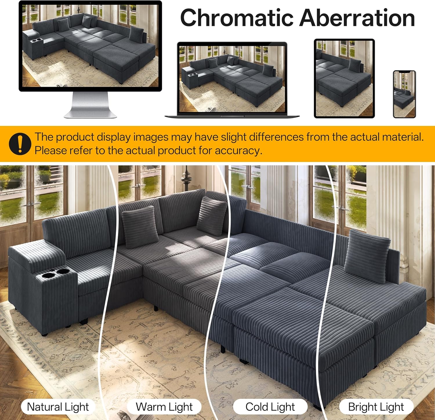 The KEIKI 110″ L-Shaped Oversized Plush Corduroy Modular Sectional Sofa redefines comfort and functionality for modern living spaces. This expansive, convertible 6-seater sleeper couch seamlessly blends luxurious design with everyday practicality, making it an ideal centerpiece for both intimate family moments and lively social gatherings. Crafted from premium plush corduroy in a sophisticated dark gray hue, the sofa offers a tactile experience that’s as inviting as it is durable. Its modular L-shape layout maximizes seating while maintaining a sleek profile, and the included ottoman adds extra lounging versatility. Whether you’re unwinding after a long day or hosting overnight guests, this sectional adapts effortlessly to your needs—equipped with a pull-out bed, hidden storage compartments, USB charging ports, and built-in cup holders for ultimate convenience. Thoughtfully engineered for easy assembly and long-term use, the KEIKI sectional is built to elevate any living room without compromising on style.