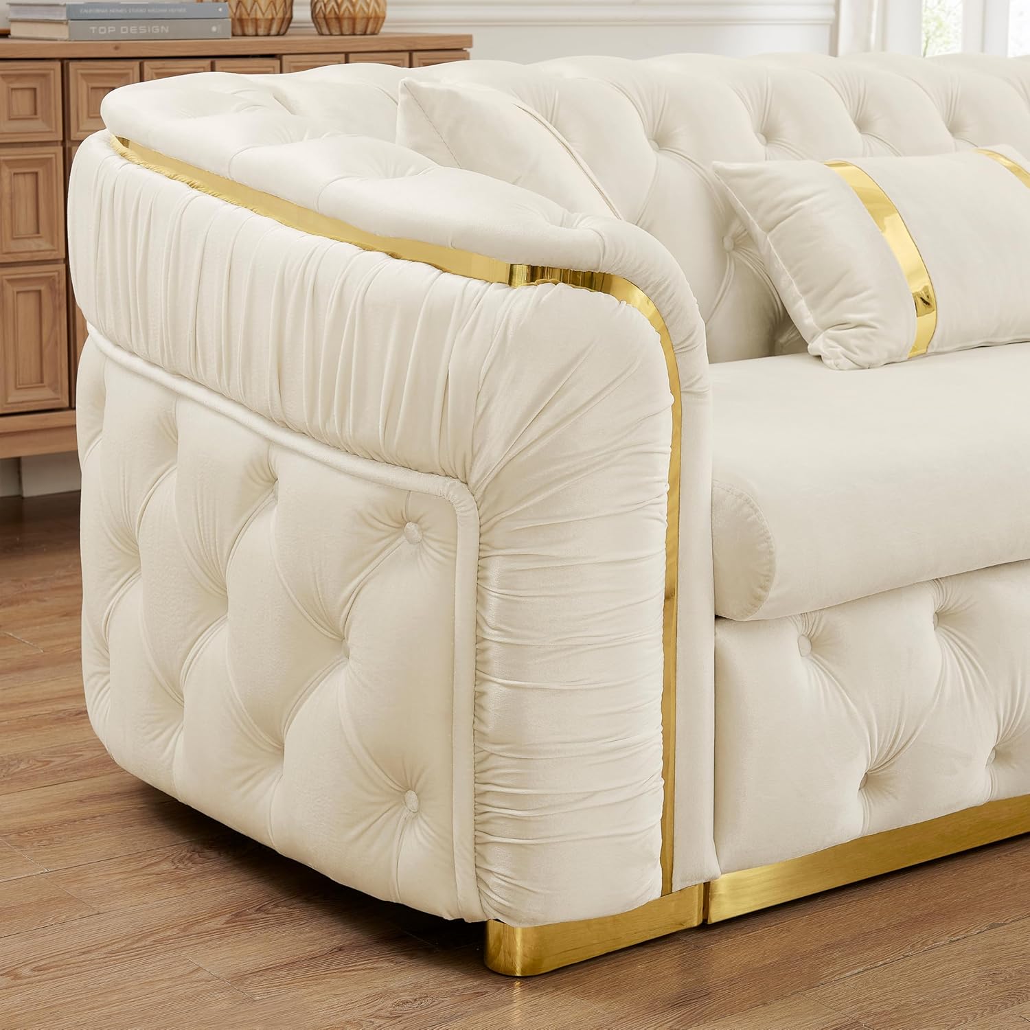 The KEIKI 111″ L-Shaped Luxury Velvet Chesterfield Sectional Sofa redefines modern luxury with its striking blend of classic Chesterfield elegance and contemporary mid-century sophistication. Designed for those who appreciate both form and function, this oversized 5-seater couch spans an impressive 110.5 inches, offering generous seating for family gatherings, intimate entertaining, or simply lounging in style. Upholstered in premium Italian velvet in a warm beige tone, the sofa features rich texture and soft-to-the-touch comfort that enhances any living space. The design is elevated further with gold stainless steel accents—elegant metallic details that catch the light beautifully and add a refined contrast to the plush upholstery. With seven generously sized matching accent pillows included, every seat feels inviting and complete right out of the box.