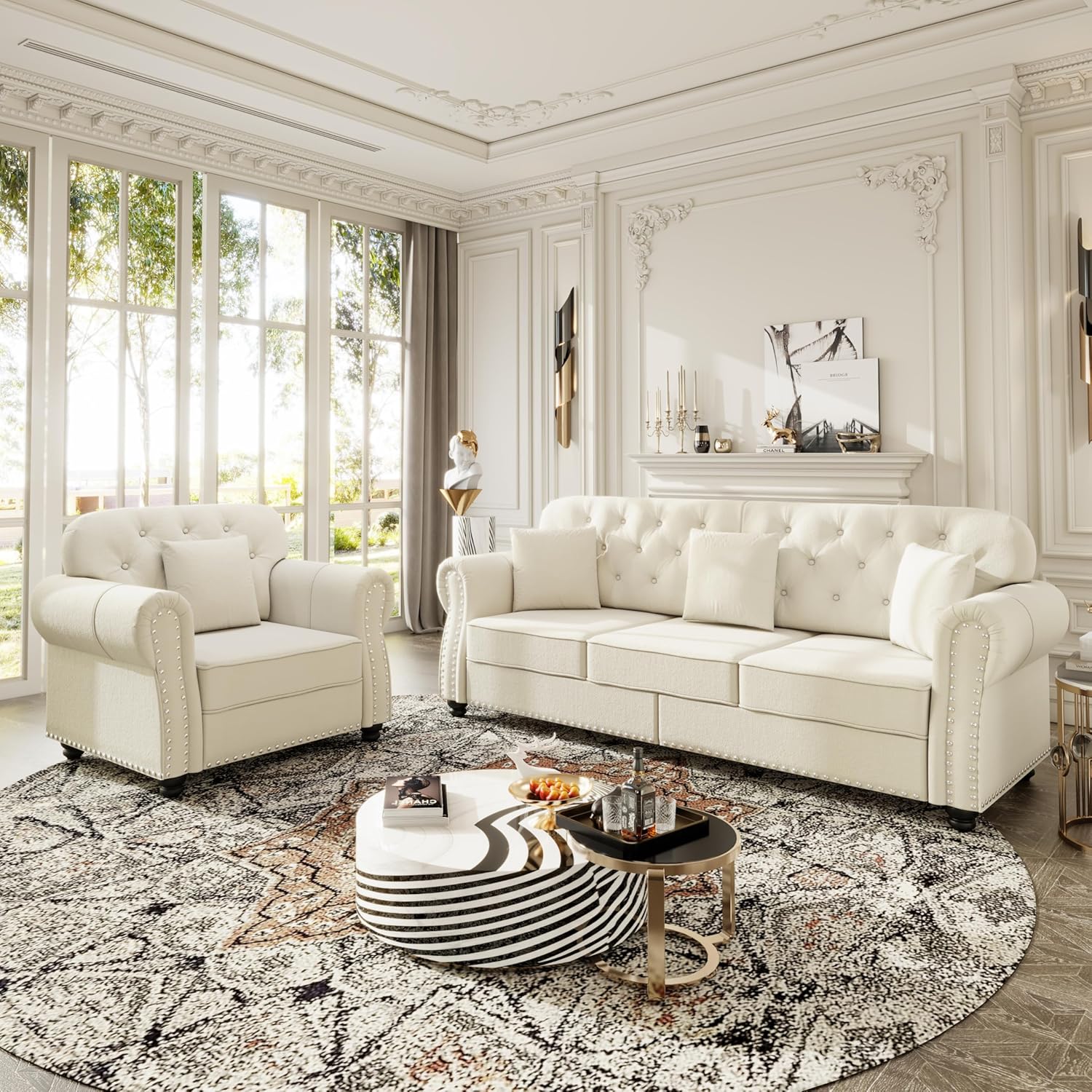 • Classic Chesterfield Aesthetic: The set features iconic design elements including deep button tufting, rolled armrests, and elegant nailhead detailing that evoke the grandeur of traditional European furniture while maintaining a contemporary edge.