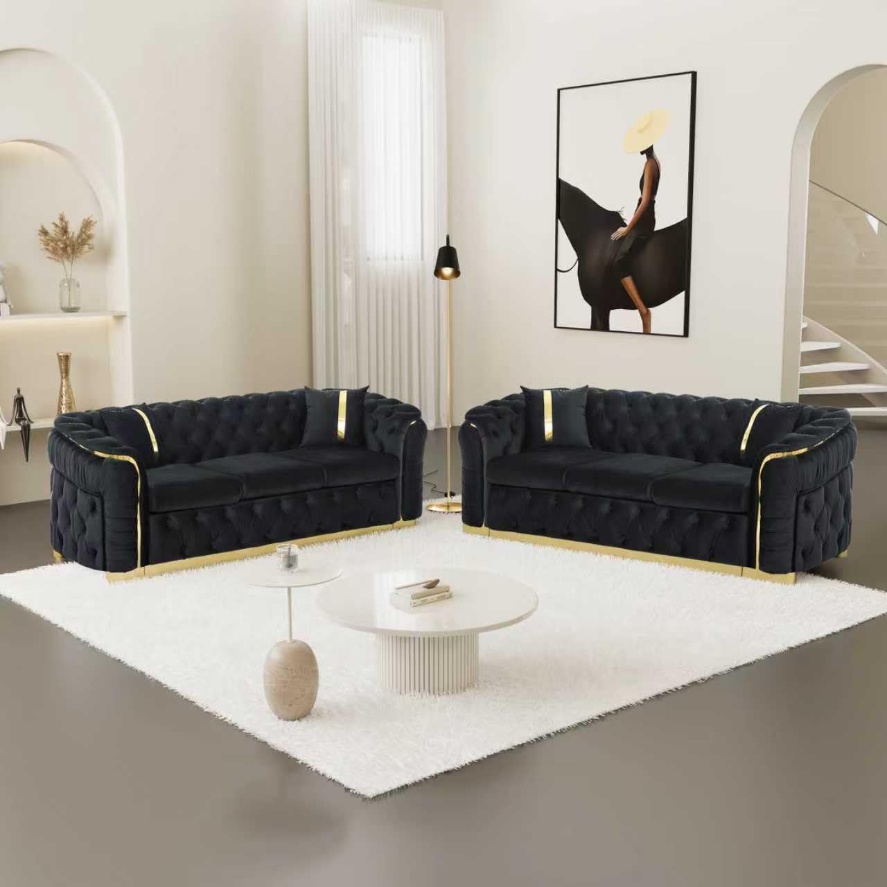 The KEIKI 2-Piece Luxury Chesterfield Sofa Set redefines modern living room elegance with its commanding presence and refined craftsmanship. This sophisticated set includes two oversized 3-seater sofas upholstered in premium 280g Italian velvet, each spanning approximately 90.6 inches in length for generous seating space. Designed with the iconic Chesterfield silhouette in mind, the sofa set features deep button tufting across the backrest that not only adds visual depth but also enhances structural integrity. Accentuated by sleek gold-toned stainless steel legs and decorative elements, the black finish creates a striking contrast that elevates any interior aesthetic. Accompanied by four matching velvet pillows, this six-seater configuration offers both luxury and practicality—perfect for hosting gatherings or creating a cozy retreat in your home.