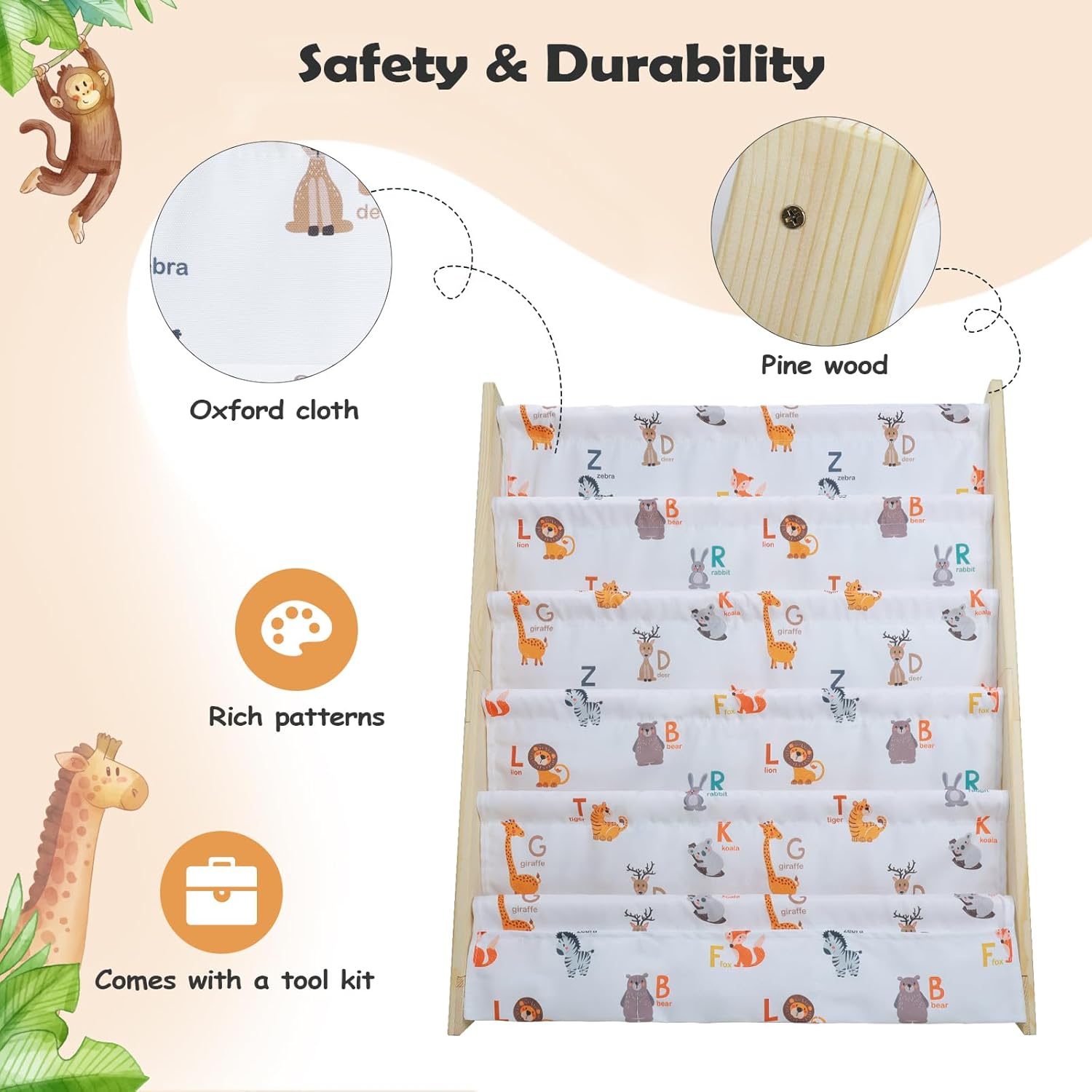 Kids Bookshelf 5 Tier Wooden Toy and Book Storage Organizer 3 Pockets Toddler Sling Book Rack with Deep Sleeves for Baby Playroom Nursery Bedroom (Animal Alphabet)
