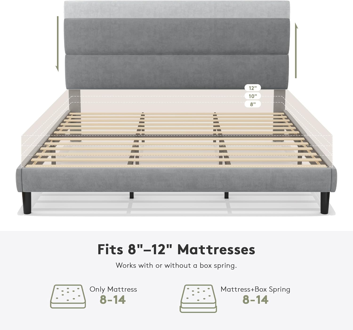 This platform bed is designed for anyone seeking a blend of style, comfort, and long-term durability. The velvet headboard doesn’t just look luxurious—it functions as a comfortable backrest for lounging, watching TV, or unwinding after a long day. Its sturdy wooden slat system ensures your mattress stays firmly supported, minimizing sagging and preserving its shape over time. Because the frame accommodates both mattress-only setups and combinations with box springs, it offers unmatched versatility for different sleeping preferences and bedding styles.