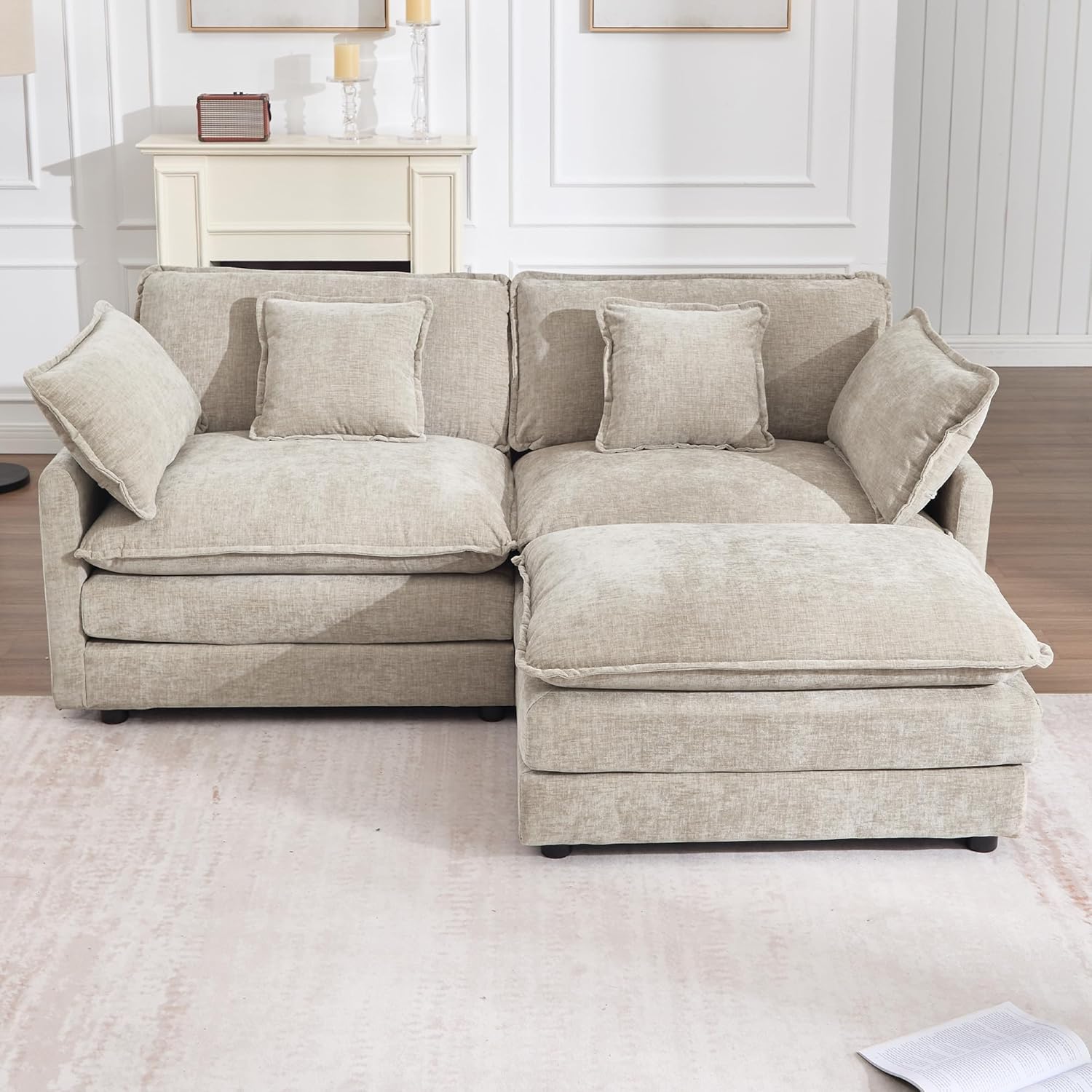 This sectional sofa is ideal for individuals or small households who need functional furniture that fits in limited floor space. Its modular nature allows for reconfiguration as needs change, such as hosting guests or adjusting for different room layouts. The deep seats and included ottoman make it perfect for unwinding after a long day, reading, or watching TV. The soft chenille upholstery adds a cozy, homey feel, enhancing the atmosphere of any small living area. Whether used in a studio apartment, a shared dorm room, or a compact urban living space, this couch delivers both practicality and comfort.