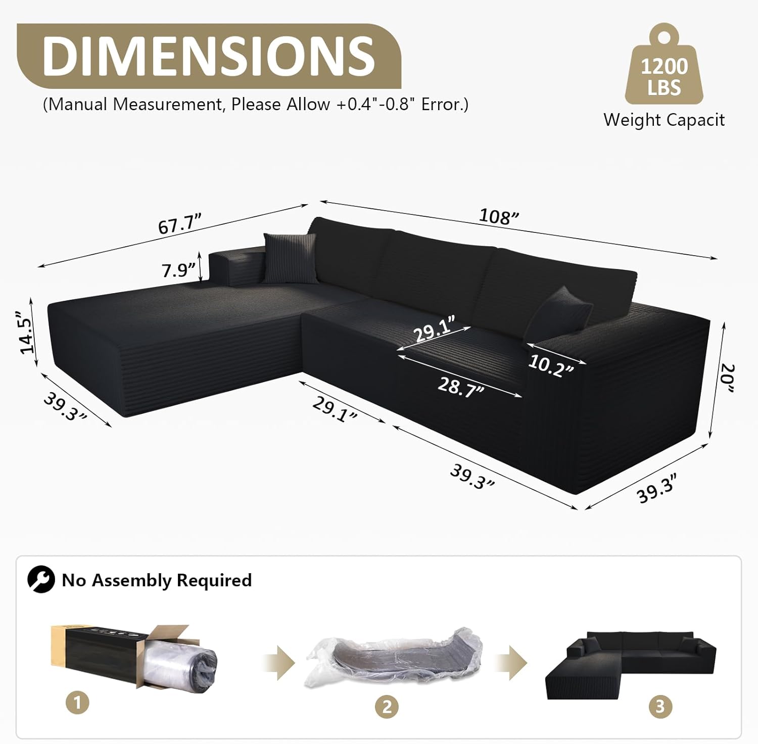 - No Assembly Required—Just Unpack and Enjoy: Shipped in a single vacuum-packed box, the sectional arrives pre-assembled and ready to use. Simply remove it from packaging, gently pat the cushions to restore their shape, and allow 3–7 days for full rebound. No hardware, instructions, or complex setups—just instant comfort.