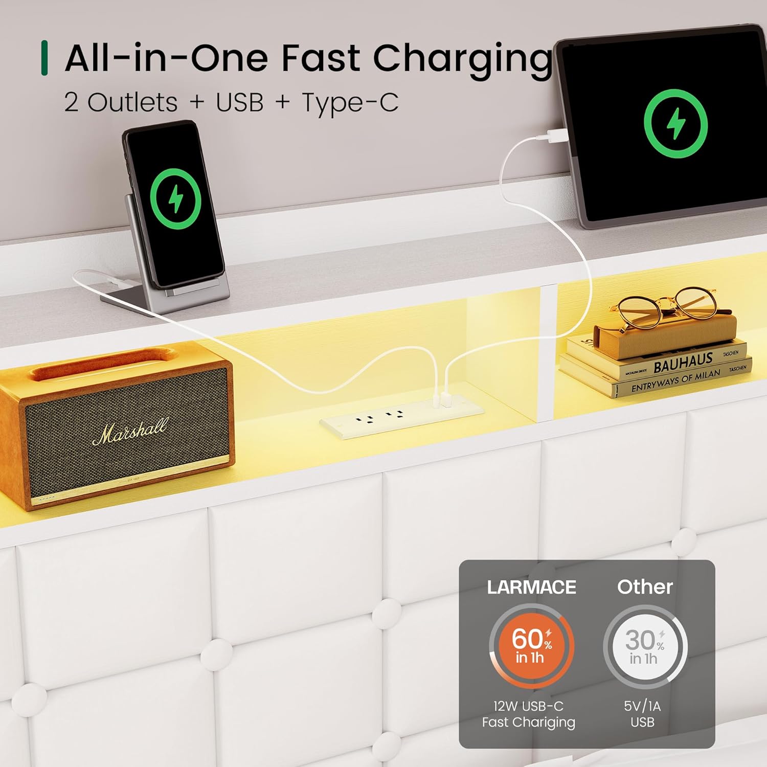 The LARMACE King Size Bed Frame offers a sophisticated blend of style, storage, and modern convenience, designed specifically for those seeking both comfort and functionality in their bedroom. This faux leather upholstered platform bed features a wooden frame with a built-in bookcase headboard, four spacious storage drawers, an integrated charging station, and customizable LED lighting. Ideal for contemporary homes or anyone looking to maximize bedroom space without sacrificing design, it eliminates the need for a box spring and supports direct mattress placement. With its clean white finish and thoughtful layout, this bed serves as both a restful retreat and a practical organizational solution.