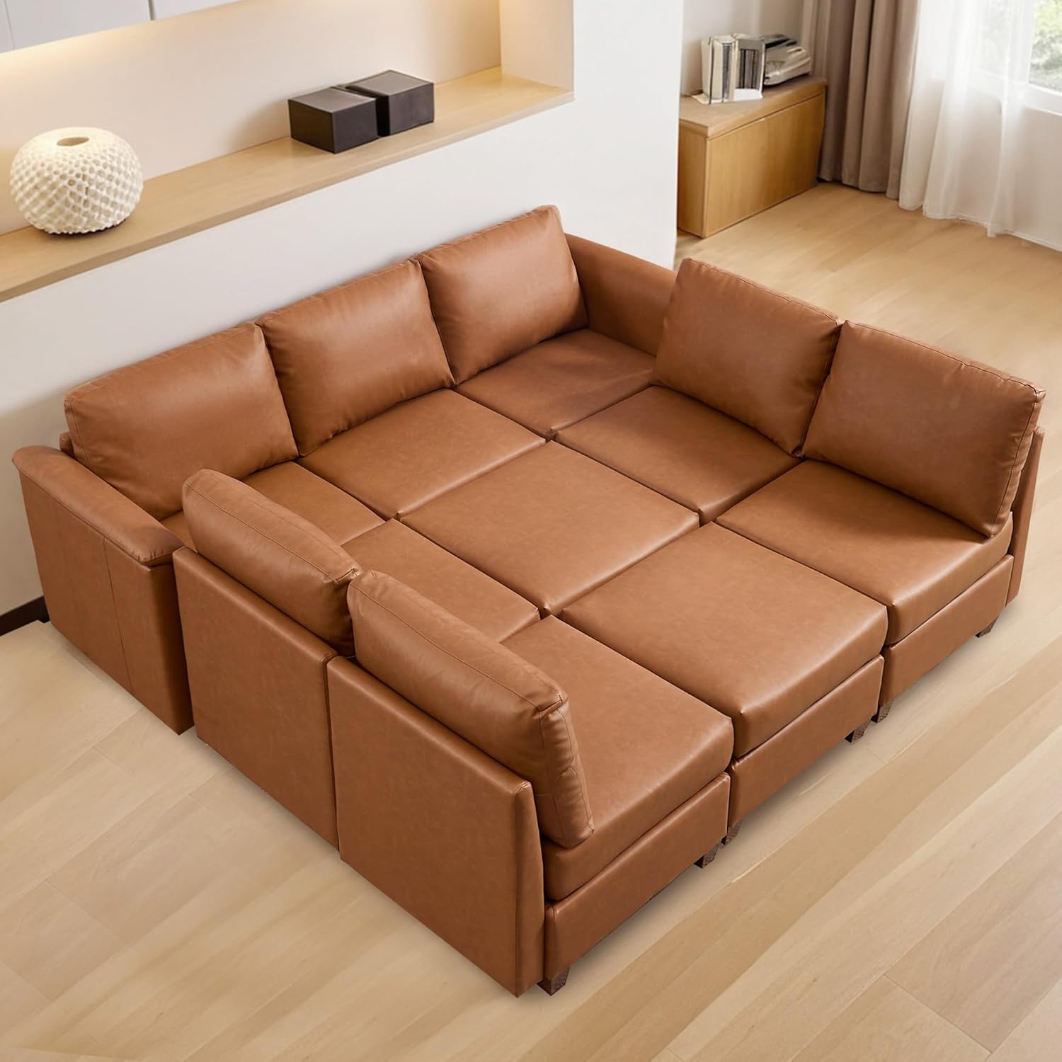 This premium leather sectional couch is thoughtfully designed to elevate your living room with a perfect blend of style, comfort, and functionality. Built with modern homeowners in mind, this modular sofa offers a sophisticated seating solution that adapts seamlessly to your space and lifestyle. Crafted from high-quality faux leather in a rich brown finish, it delivers the luxurious appearance of genuine leather while remaining easy to maintain and resistant to daily wear. The reversible 9-seat configuration provides exceptional flexibility, allowing you to reconfigure the layout as needed—whether left-facing for a cozy corner or right-facing to maximize open floor space. Integrated storage compartments under each seat offer practical organization for blankets, pillows, books, or other household essentials, helping you keep clutter at bay without sacrificing aesthetics. Ideal for family rooms, entertainment spaces, or stylish lounges, this sectional combines generous seating capacity with smart design features for everyday use.