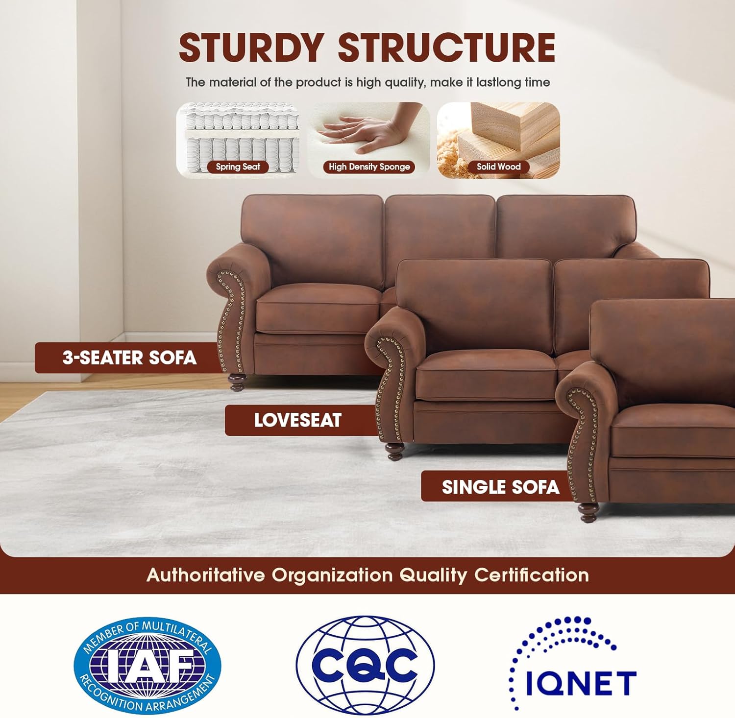 - Sturdy & Durable Construction: The foundation of this sofa set lies in its robust solid wood frame, engineered for long-term strength and resistance to sagging or warping. Premium serpentine springs under the seats add responsive bounce and maintain shape over time, while high-quality foam padding retains its loft and comfort. Wooden feet with non-slip pads protect flooring from scratches and enhance stability on tile, hardwood, carpet, or laminate surfaces.