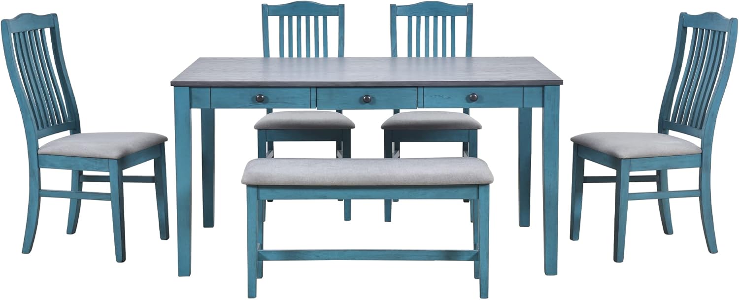 ) showcasing the dining table, chairs, bench, and storage features from multiple angles. These visuals allow you to verify the actual color tone, wood grain texture, chair cushioning, and drawer mechanisms before making your purchase. Pay close attention to how the antique blue finish appears under different lighting conditions, as natural light can affect perceived shade.