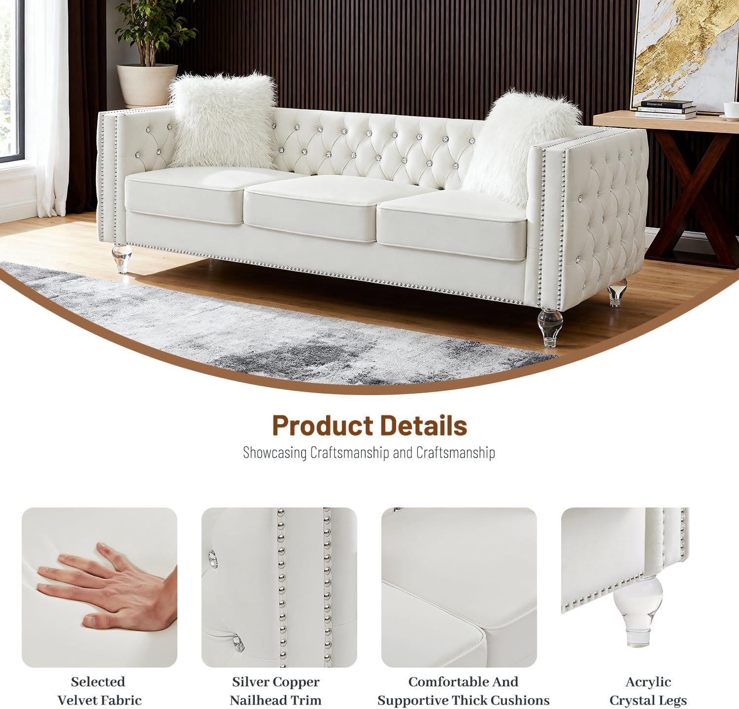 This luxury 3-seater sofa couch redefines contemporary elegance with its harmonious blend of timeless design and modern sophistication. Crafted for discerning homeowners and interior enthusiasts alike, this premium beige velvet sofa offers a perfect balance between opulence and practicality. Featuring deep diamond button tufting along the backrest and striking acrylic crystal legs, the piece exudes a refined aesthetic that instantly elevates any living space. The Chesterfield-inspired silhouette—complete with rolled arms and structured detailing—adds classic charm while remaining fresh and current. With an overall length of 83.07 inches, this compact yet spacious 3-seat configuration ensures comfort without overwhelming smaller or medium-sized rooms. Whether placed in a sunlit lounge, a stylish apartment, or a transitional family room, this sofa serves as a sophisticated centerpiece that enhances both form and function.