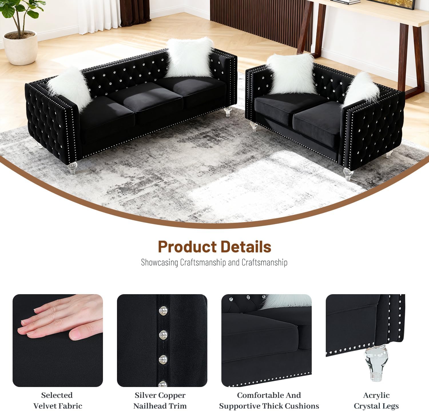 This luxury 2-piece sofa couch set redefines modern living room elegance with its bold design and premium craftsmanship. Featuring rich black velvet upholstery, each sofa in this matching pair is adorned with intricate diamond button tufting that adds depth, dimension, and a touch of opulence to your space. The sleek acrylic crystal legs provide both structural support and a striking visual lift, giving the furniture an airy, contemporary feel. Designed for discerning homeowners and renters alike, this 2PC couch set blends high-end aesthetics with practicality, making it ideal for stylish apartments, lofts, or refined living rooms seeking a dramatic focal point.